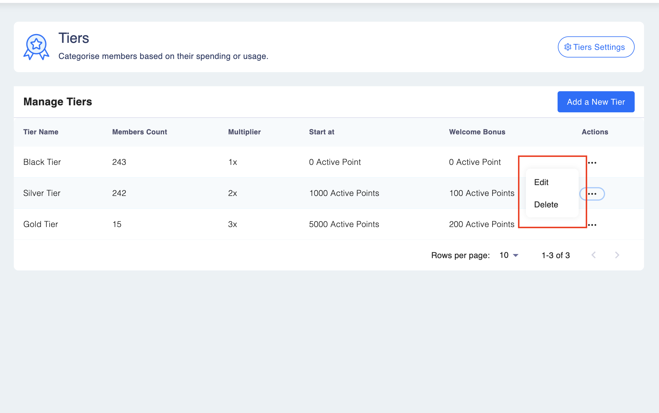 To edit an existing tier, go to Tiers ➝ Select a tier to edit ➝ Menu ➝ Edit and add the information as per the tier requirement.