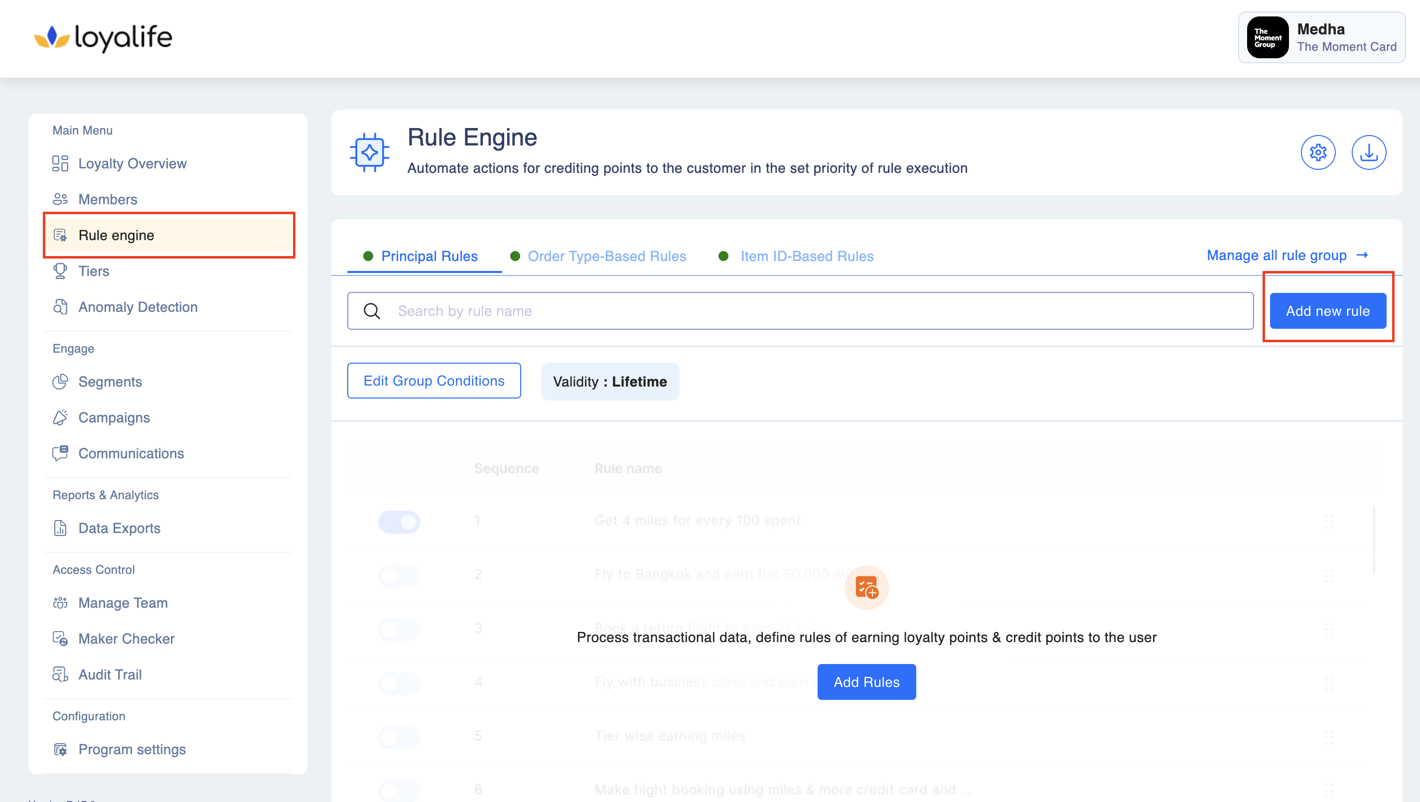 In Loyalife, the Principal Rule Group typically handles the core earn logic applicable across all members. Let's start by learning how we can create Rules under the Principal Rules group.