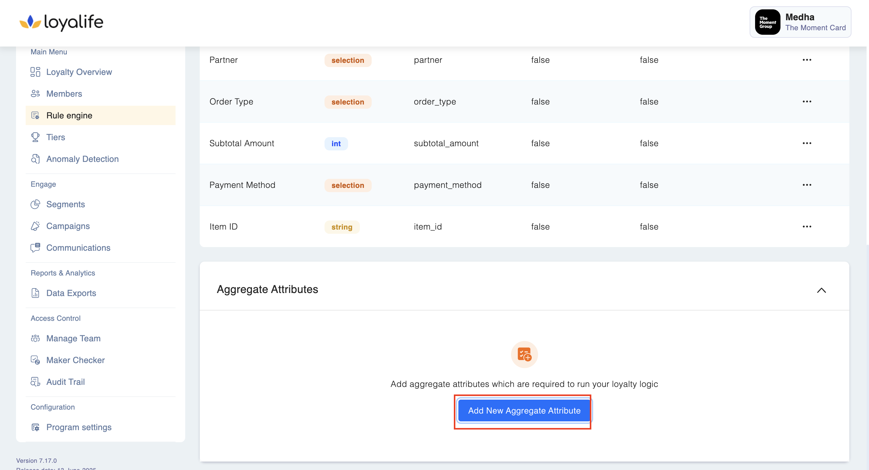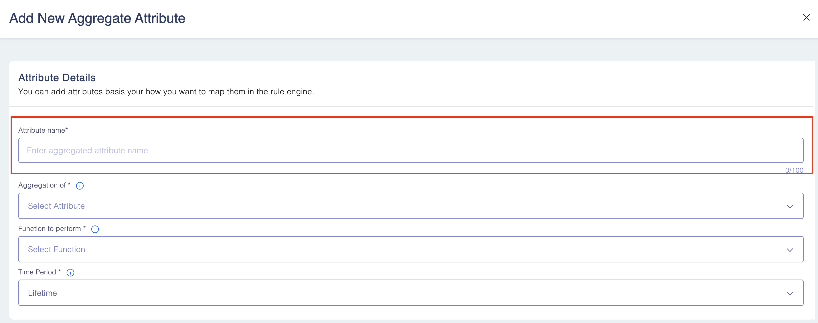 Rule Engine > Click on the Settings icon (⚙️) > Locate the Aggregate Attributes card