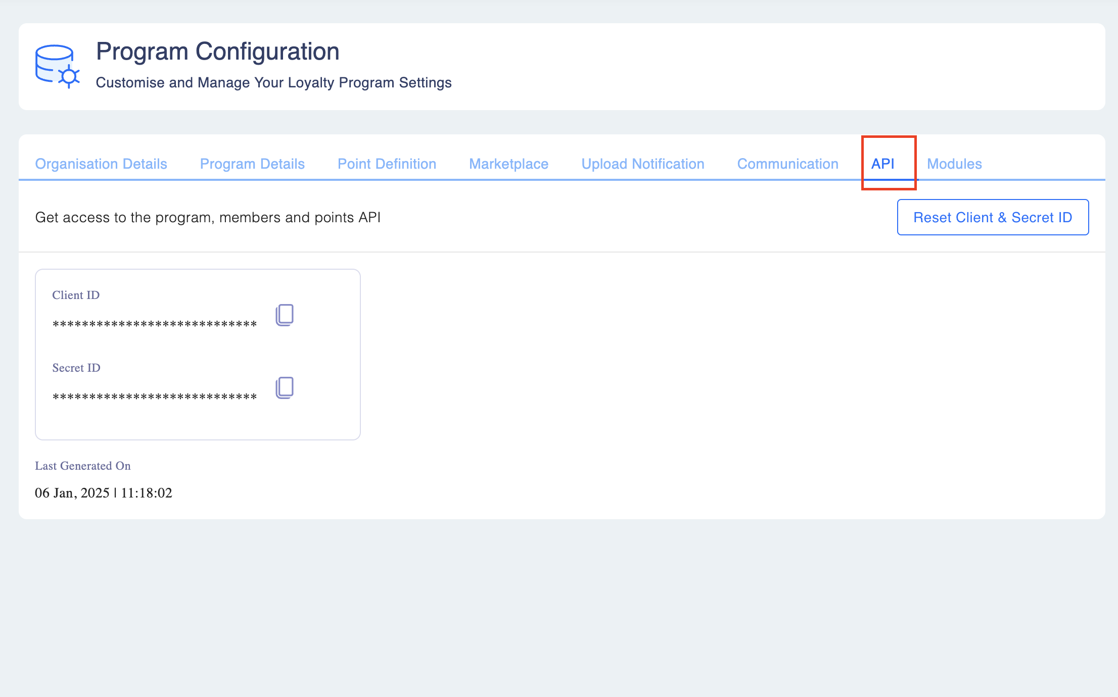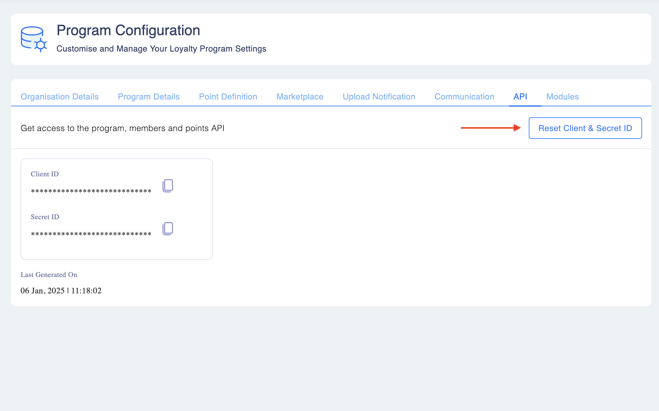 - Automatic Generation: When a new program is created on Loyalife, it automatically generates a unique Client ID and Secret ID.