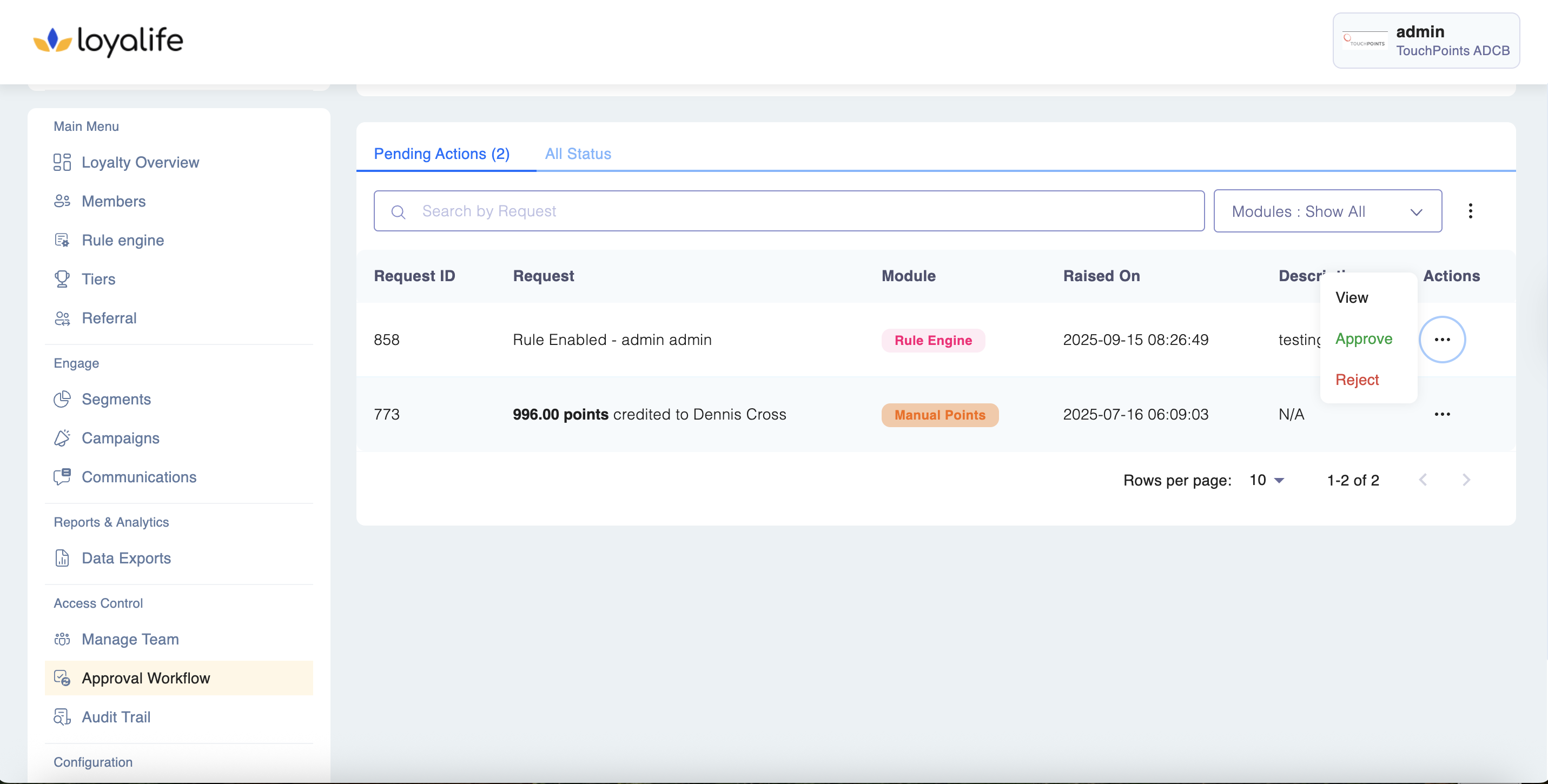 In the ‘All Status’ module, the user can view all the actions that have come under the maker checker workflow. It shows the status of the actions along with other details. The user can choose to approve/ reject the pending transactions from here as well.