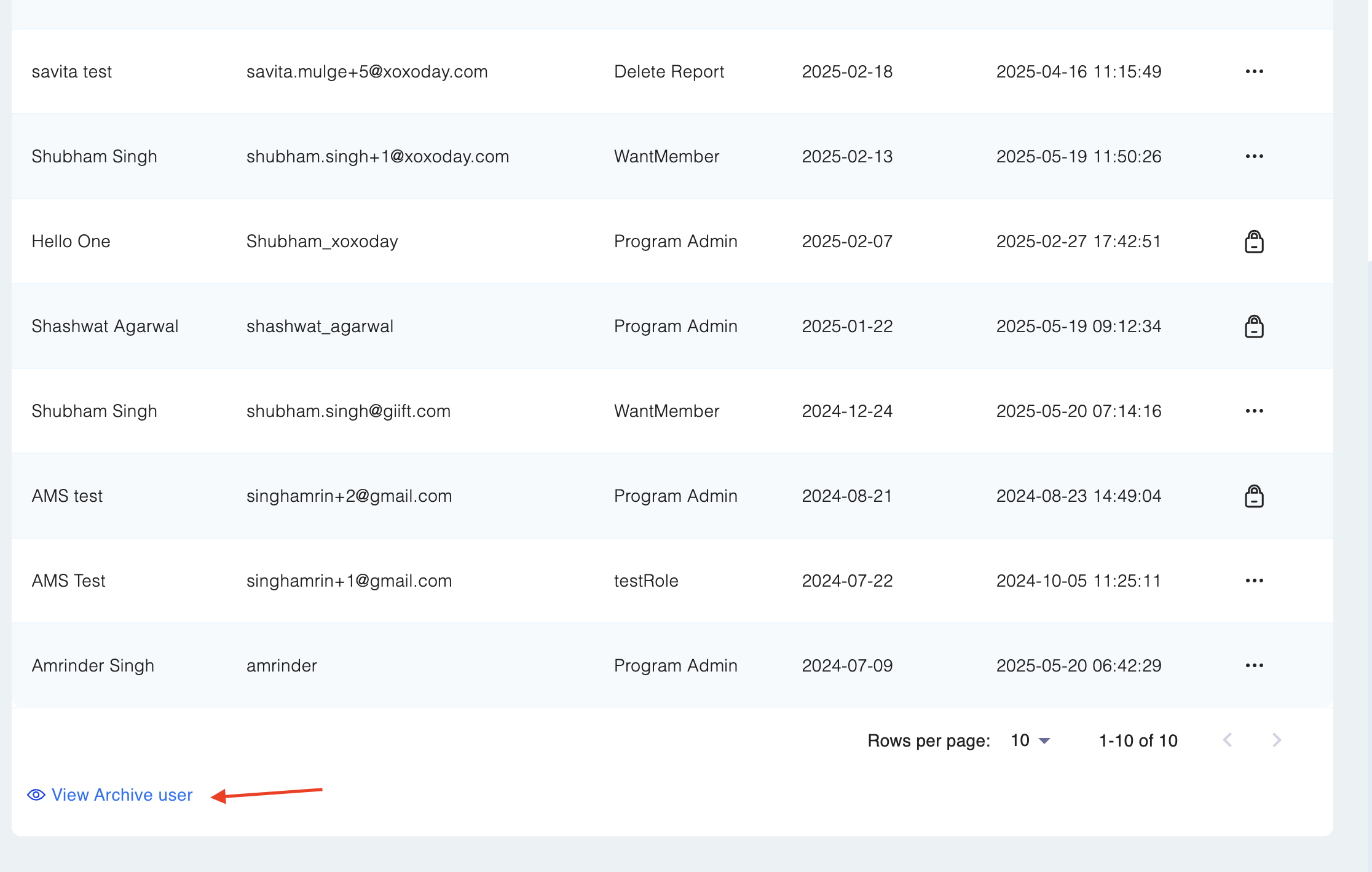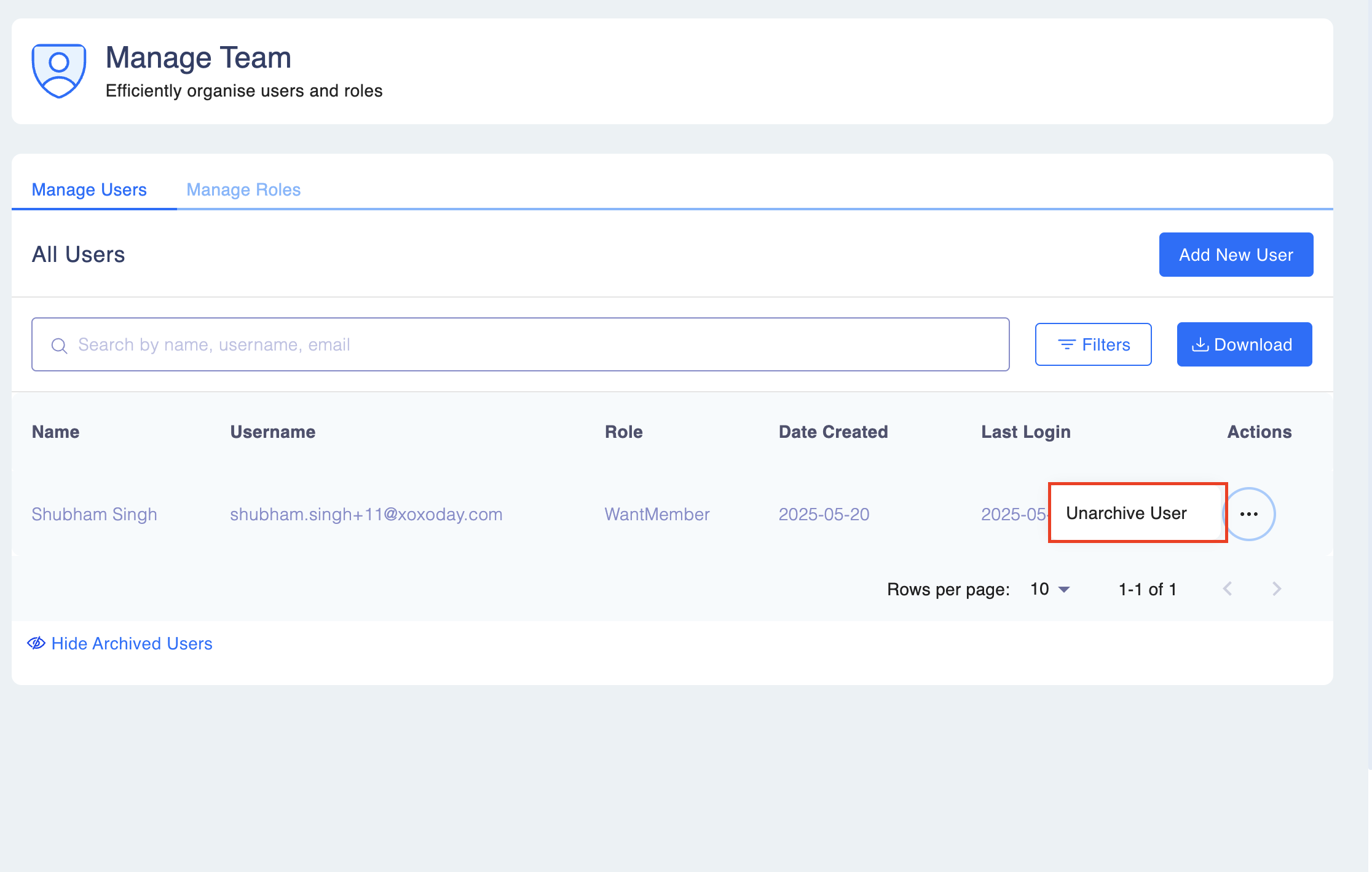 Step 2: Click on View Archived Users at the bottom left. Find the archived user by searching for their Name, Email, or Role.