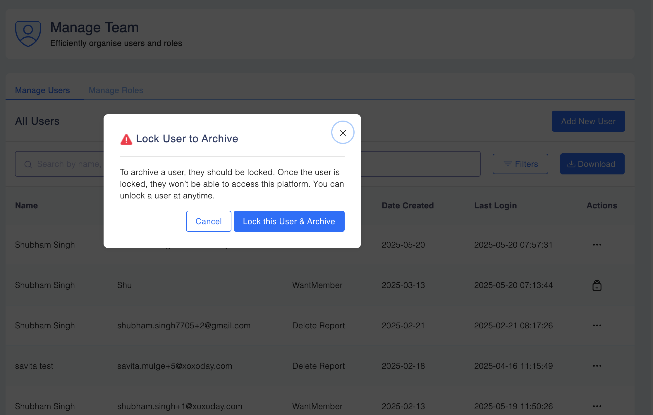 - Navigate to the Access Control ➝ Manage Team ➝ Manage Users ➝ Select a User ➝ Click Menu ➝ Archive User.