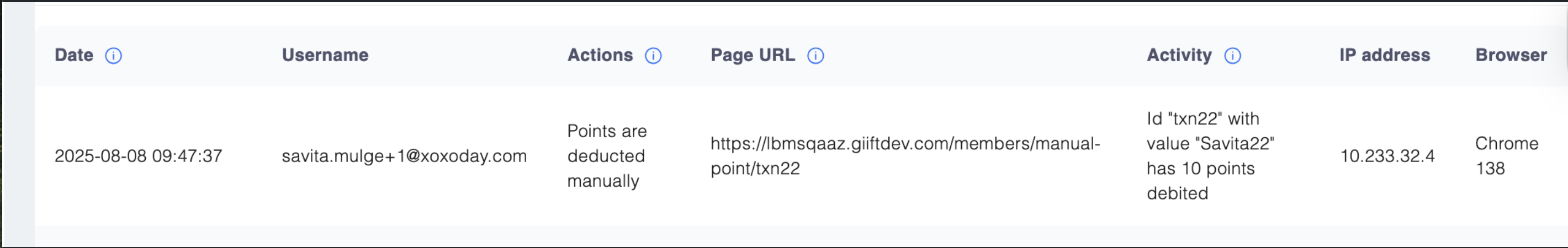 | Activity | Details of the action, including the file name. | Bulk points adjustment via upload. File bulk_upload_100.csv. |