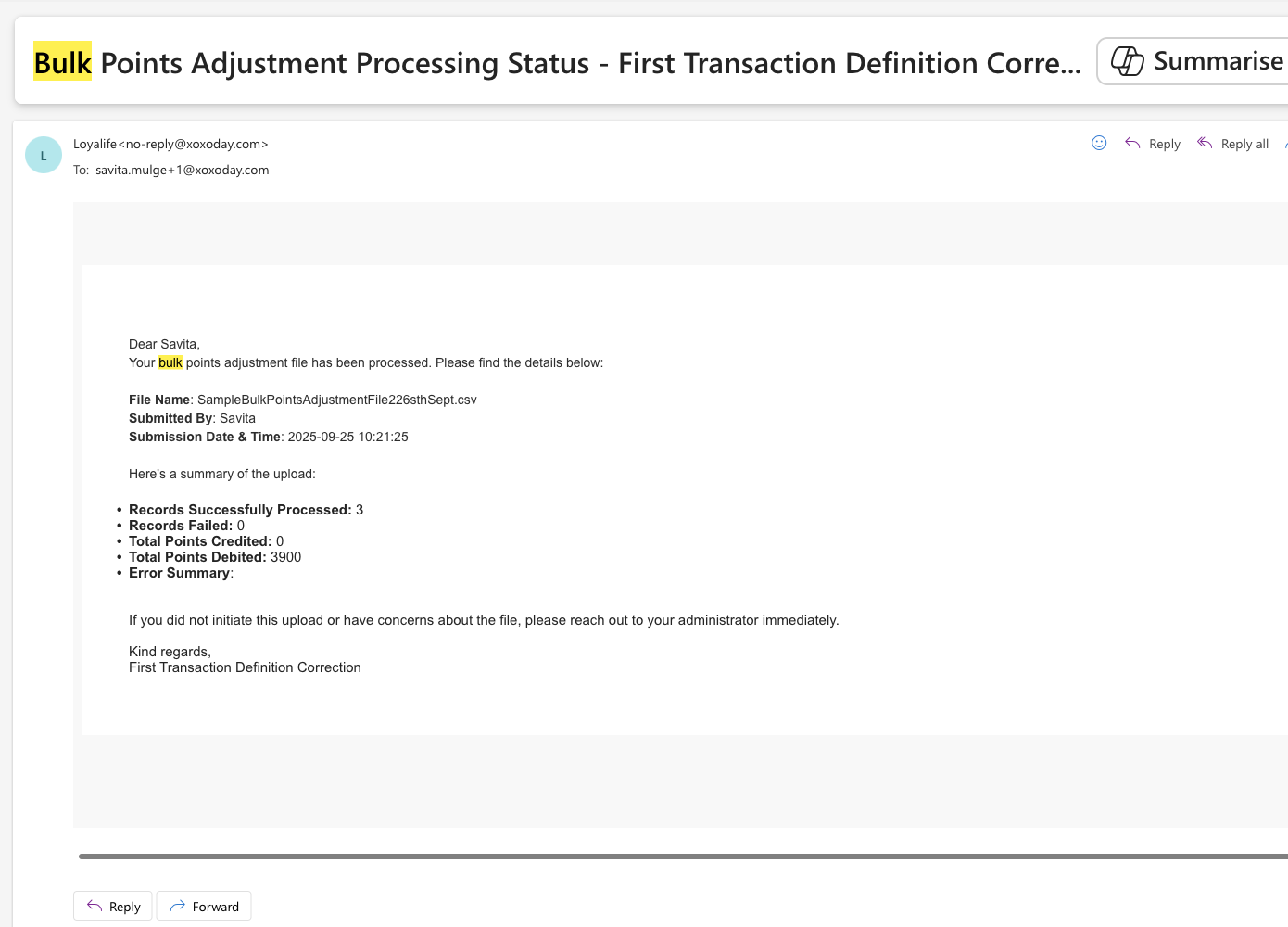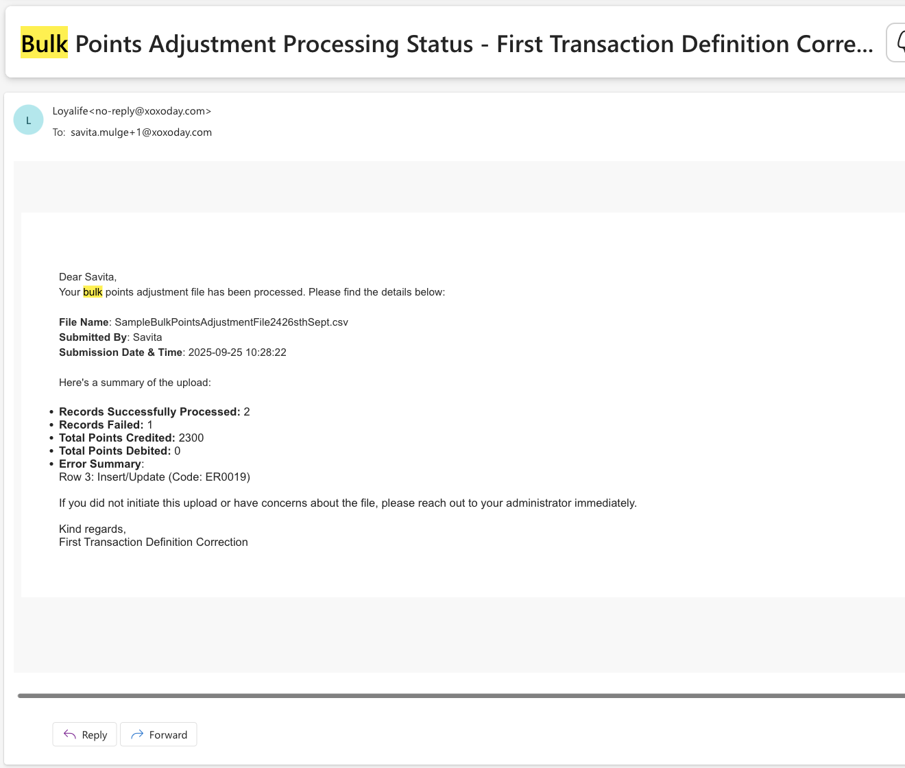 ✅ Example: “Bulk points adjustment rejected for file bulk_upload_100.csv.”