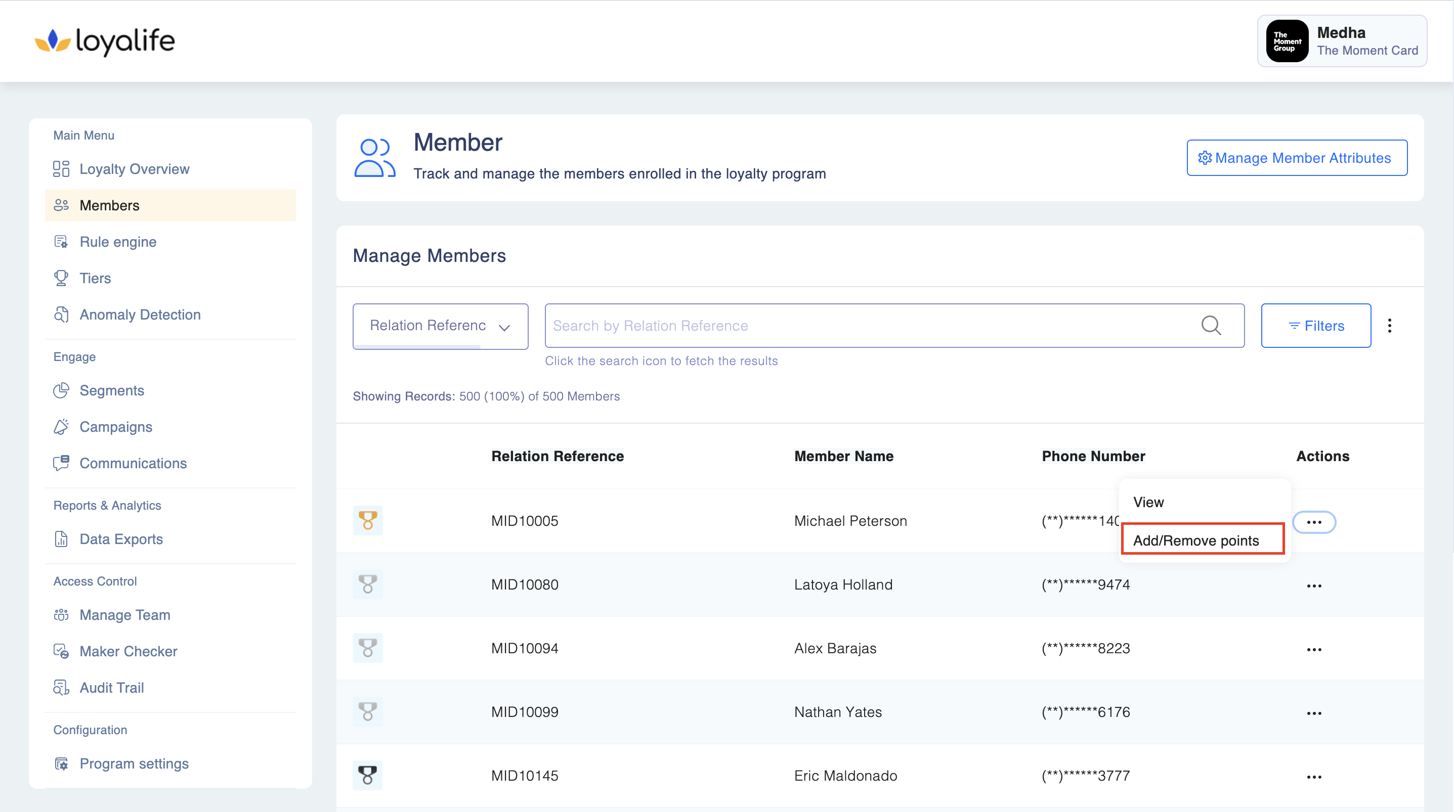 Step 1: To credit or debit points, access a specific member account by navigating to Members → Search Members → Member Profile. Click on Action and select Add or Remove Points.