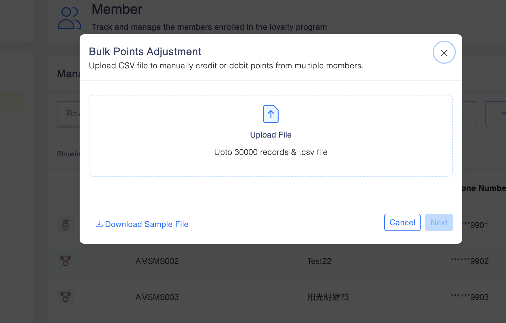 Download Sample File button: Sample File for Bulk Points Adjustment