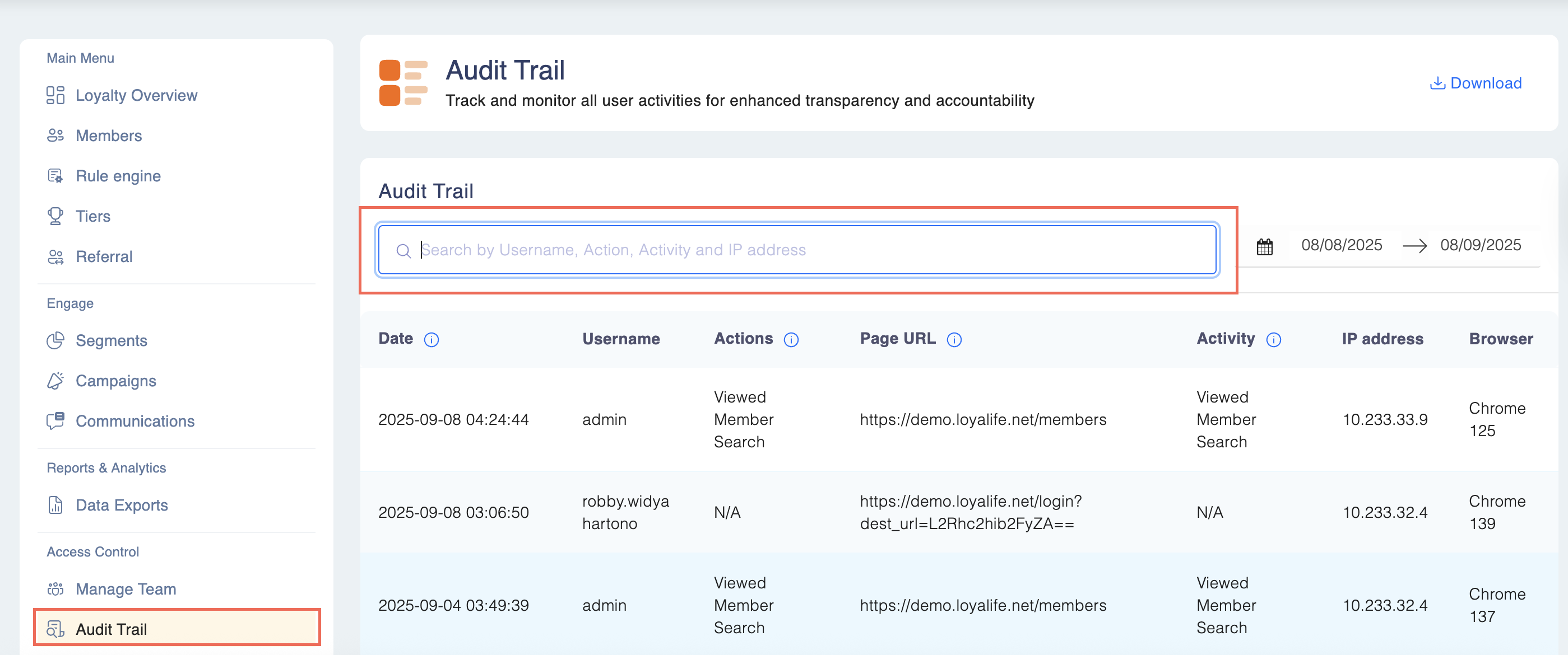 Step 2: Use the search and filter options (e.g., date range, user, action type) to view entries related to Bulk Points Adjustment.