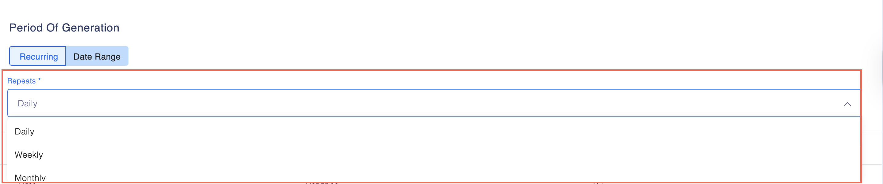 - Period of Generation: Select how frequently the report should be generated (e.g., daily, weekly, monthly). or choose the Date Range where you can define the start and the end date.