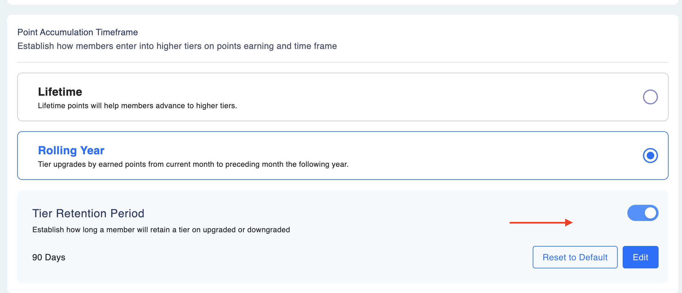 - Here you have the option to configure the Tier Retention Period which is to establish how long a member will retain a tier on upgraded or downgraded. Simply toggle next to tier retention period and click one edit to add custom period.