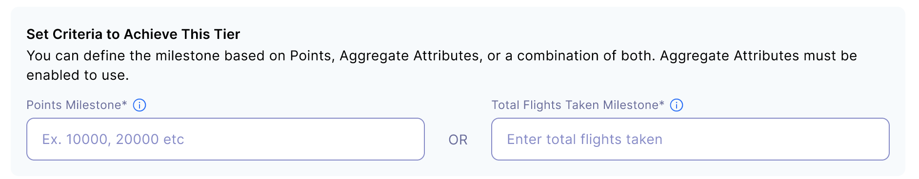 You can define the milestone based on Points, Aggregate Attributes, or a combination of both. Aggregate Attributes must be enabled to use.