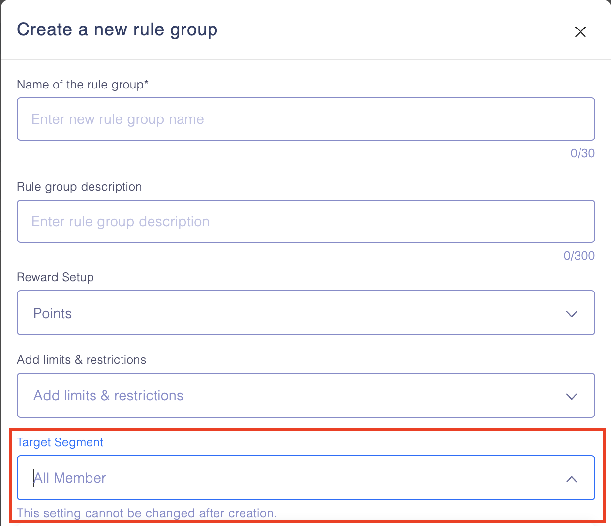 3.5 Target Segment: Select the target segment for this Rule group. It can be all members or you can select a segment from the drop down. Loyalife platform allows for linking a rule group with one manual segment.
