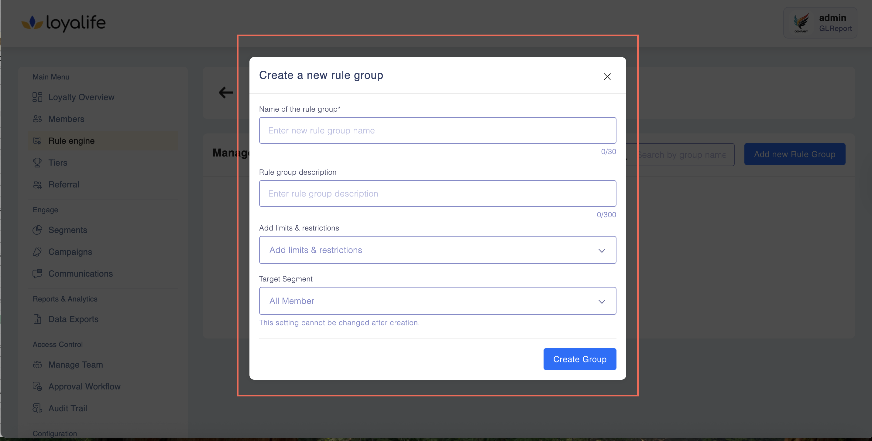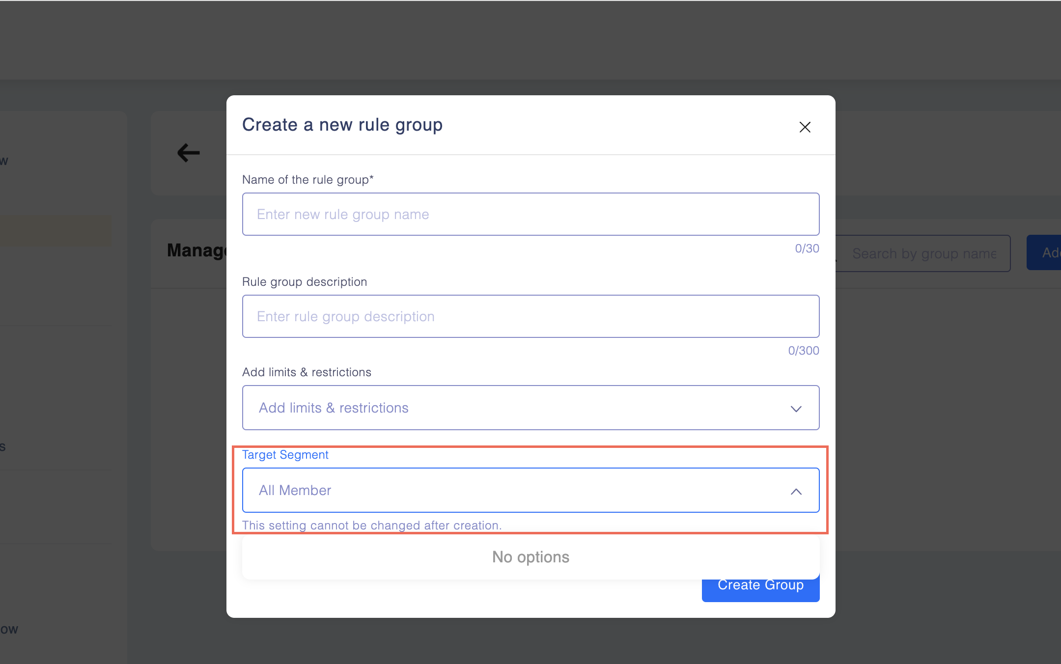 - 3.4 Target Segment: Select the target segment for this Rule group. It can be all members or you can select a segment from the drop down. Loyalife platform allows for linking a rule group with one manual segment.