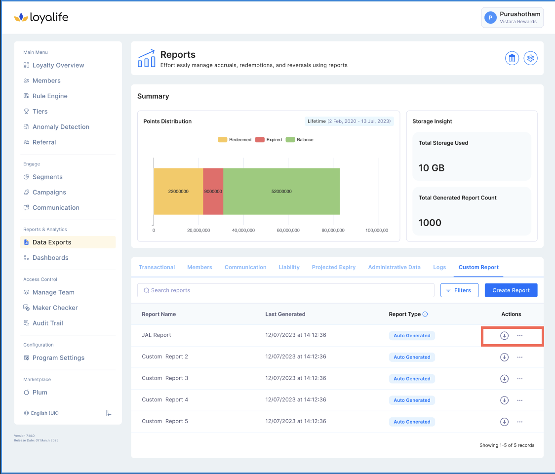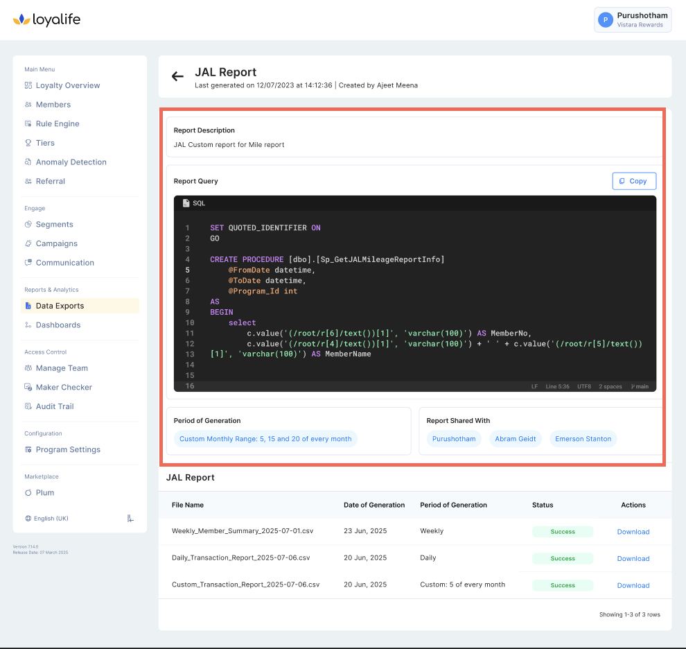 The Custom Report module in the Loyalife Reports section empowers Admins (not Program Admins) to build dynamic reports tailored to business needs. It supports SQL query writing, cron job scheduling, and report sharing/visibility management, and is available only for private cloud and on-premise clients.