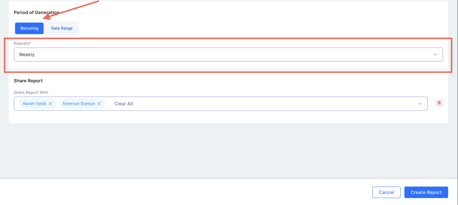 - Recurring: Defines how frequently the report should be generated. Options include: Daily – For real-time monitoring of new transactions. Weekly – Provides a summary of transactions over a week. Monthly, Quarterly and Annually – Useful for trend analysis and financial reconciliation.
