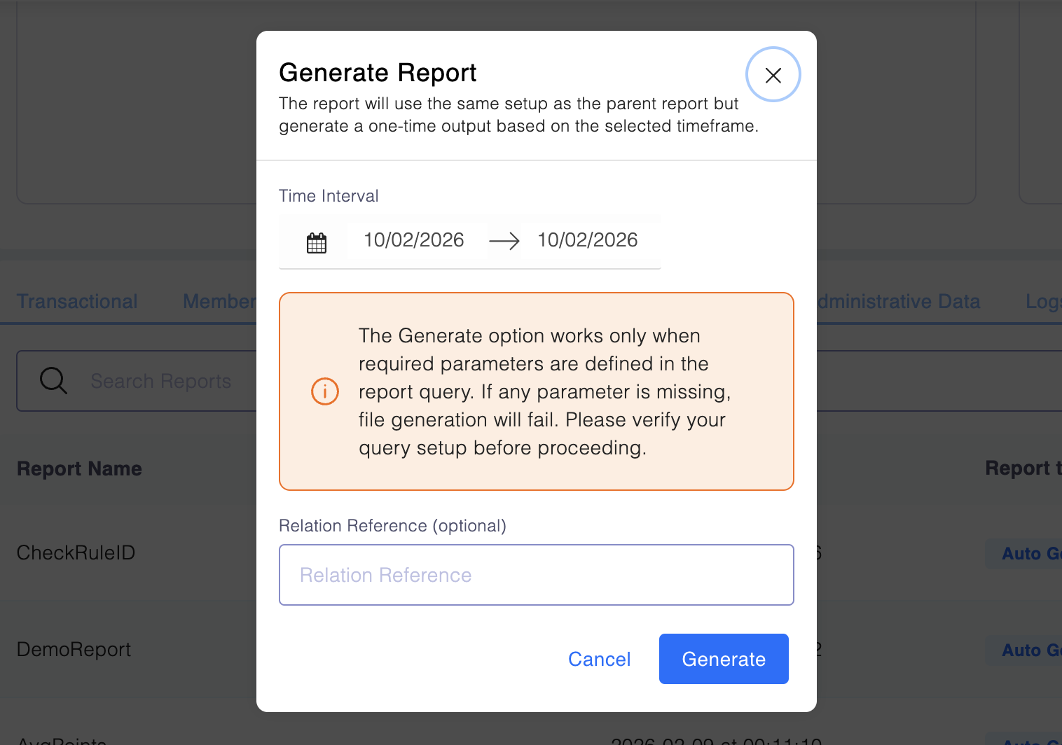 In addition to recurring setups, each Custom Report now includes a Generate option that lets you produce a report immediately for any date range: