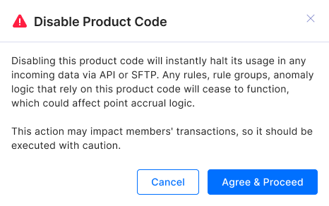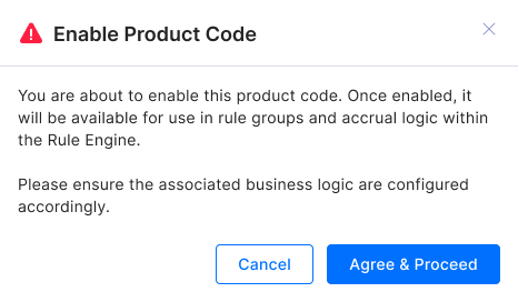 - You will see a pop up confirming whether the product code was enabled or disabled. Click "Agree and Proceed" to proceed with your selection.