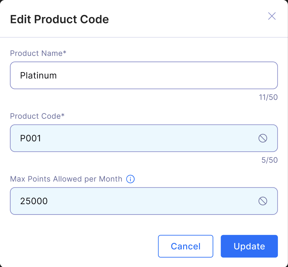 Step 3: Add the details such as Product Name, Product Code and Max Points Allowed per Month and Save Product Code.