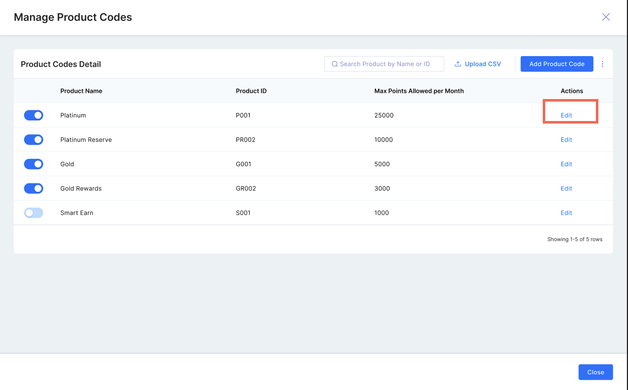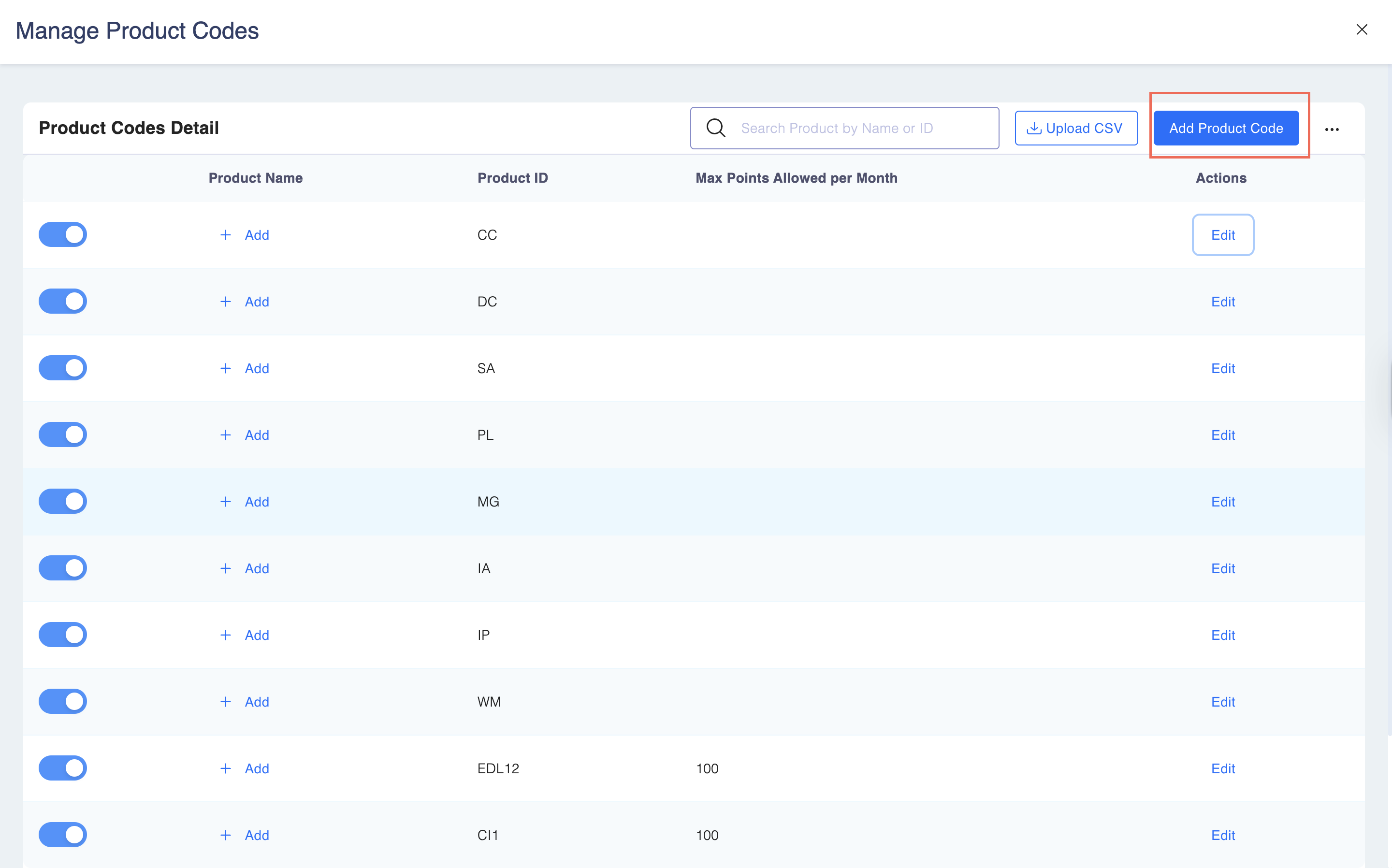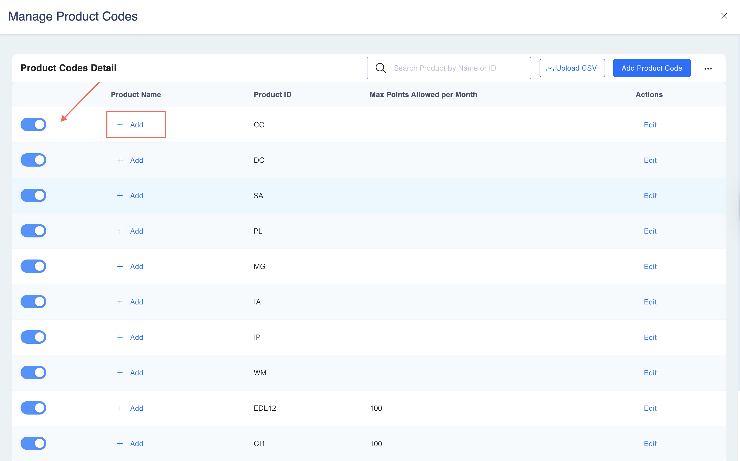- To enable or disable a product code - Use the toggle switch next to the product code.