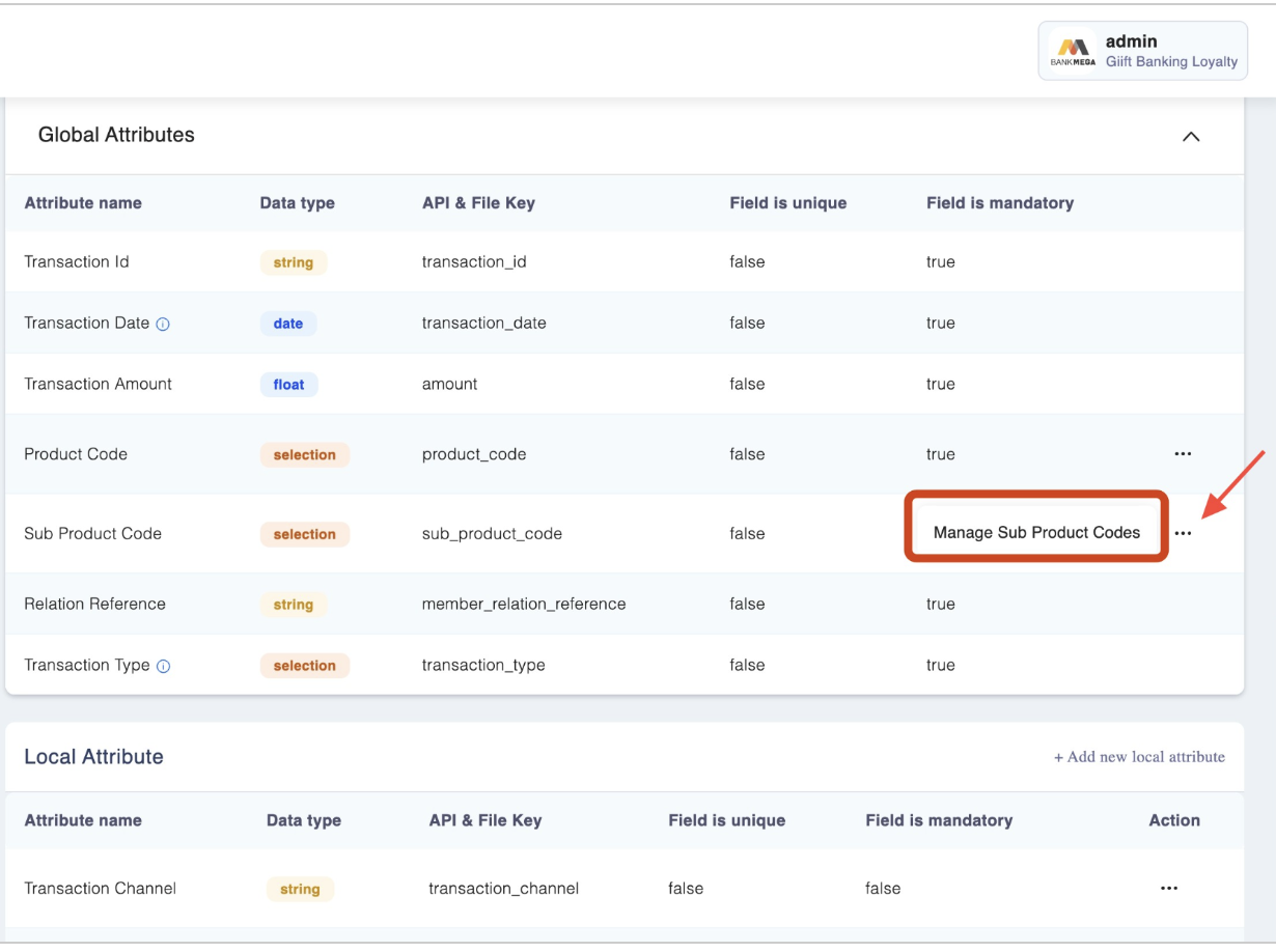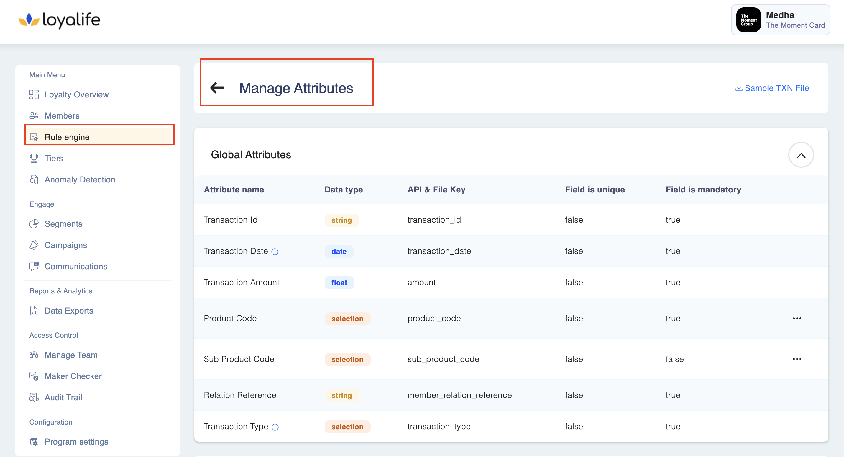 These attributes are accessible from Rule Engine ➝ Manage Attributes. Global attributes are used to define important transactional data that influence the rules created for the loyalty program.
