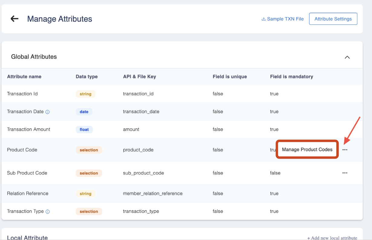 Step 1: Navigate to Rule Engine ➝ Manage Attributes. Click on the three dots next to Product code as shown below and select Manage Product Codes.