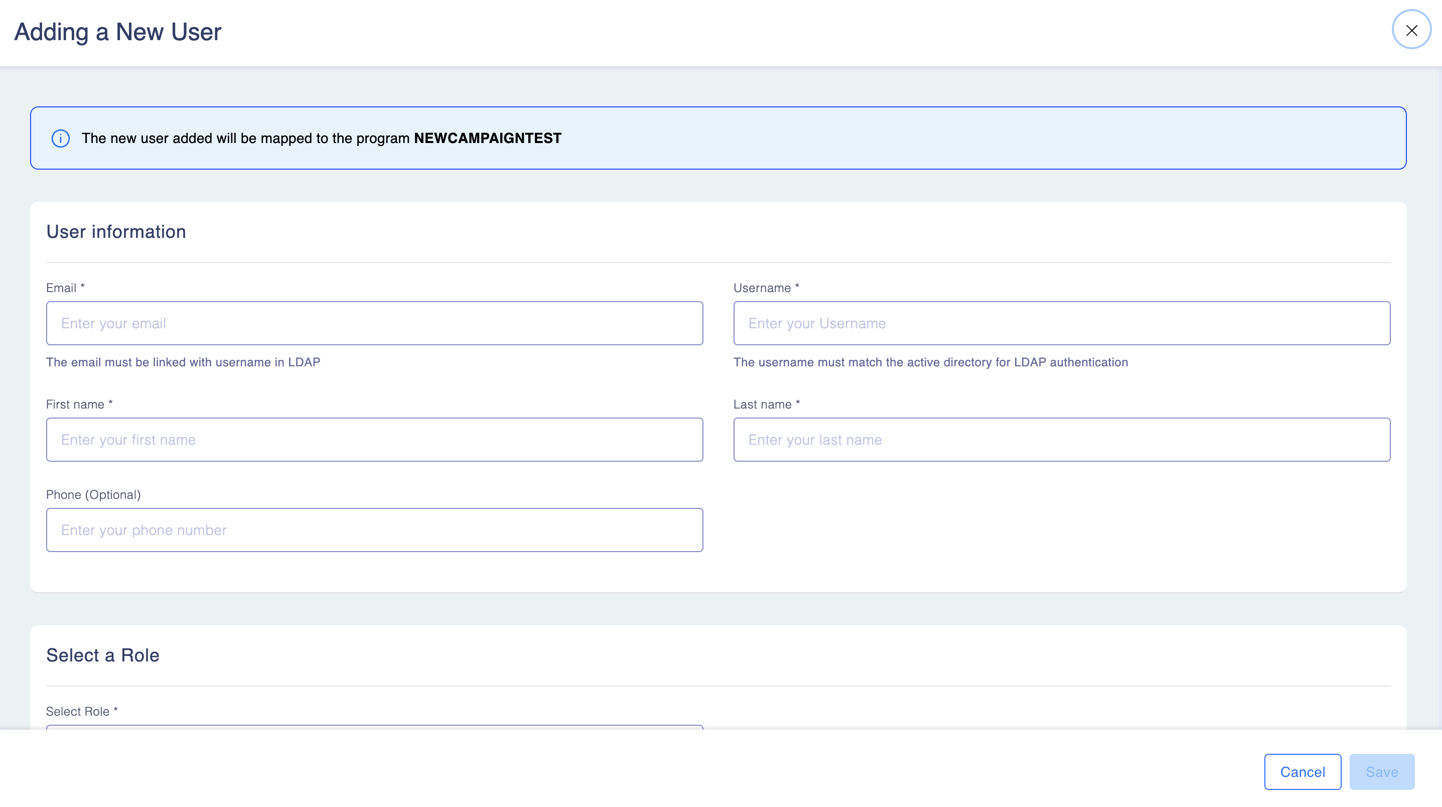 • e. Role Selection: Using the drop-down menu, choose the appropriate role for the user based on their responsibilities. At this point, you can also "Add a New Role", for more details view the Managing Roles Module Documentation.