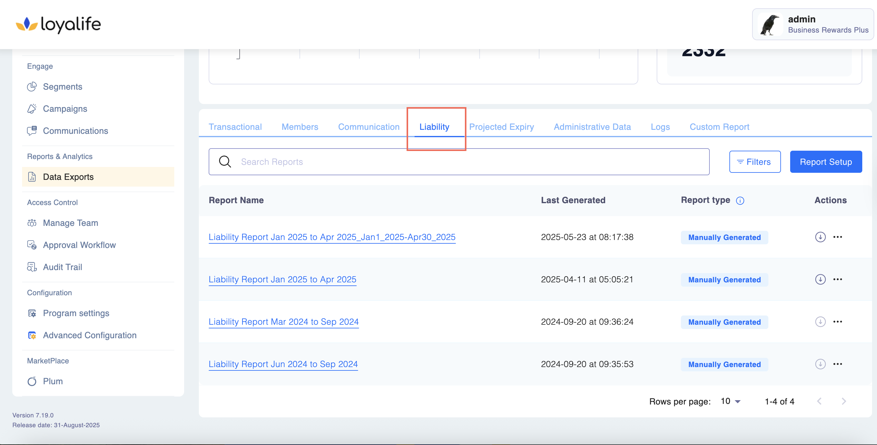 - Navigate to Reports & Analytics > Data Exports > Liability tab.