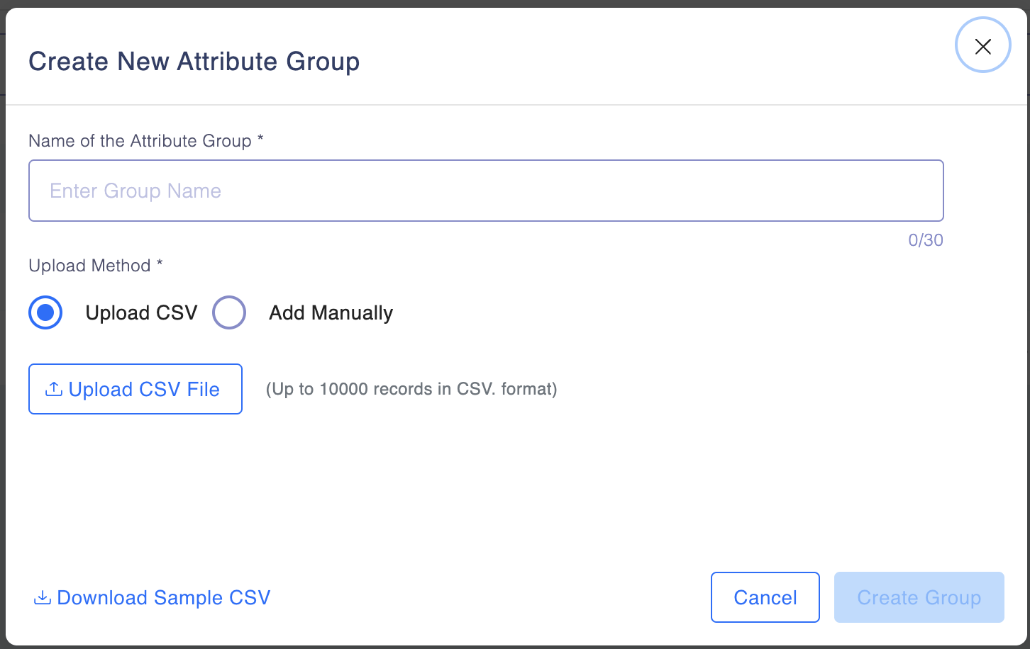 - Click “Upload CSV” tab in the Manage Attribute Grouping modal