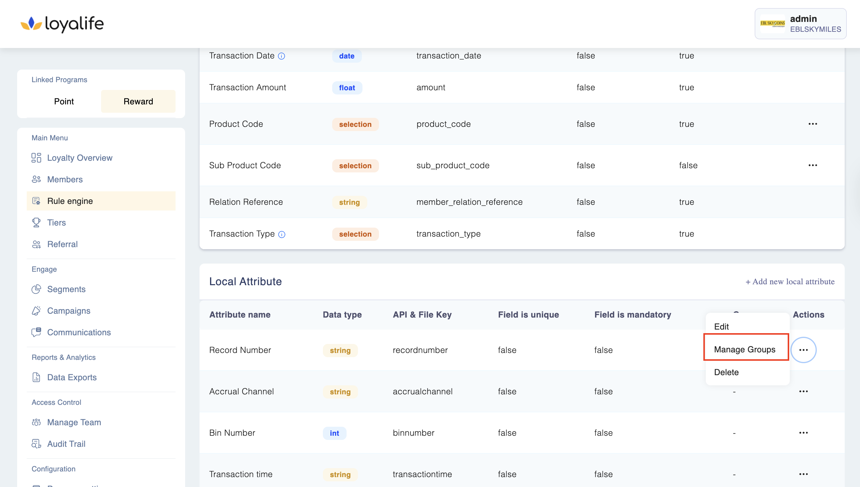 - To manage a group navigate to Action next to a Local Attribute and click on "Manage Groups" for a local attribute.