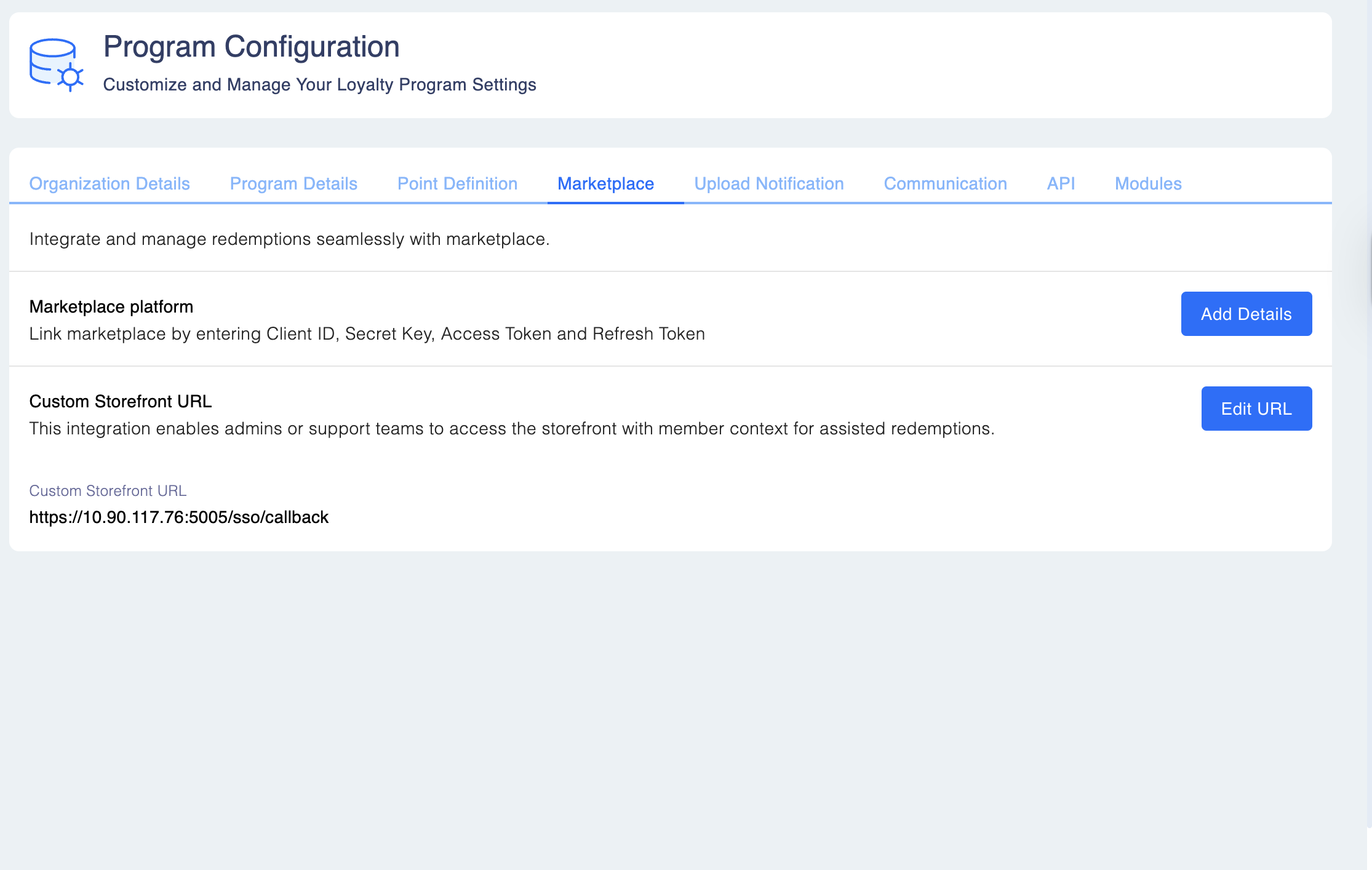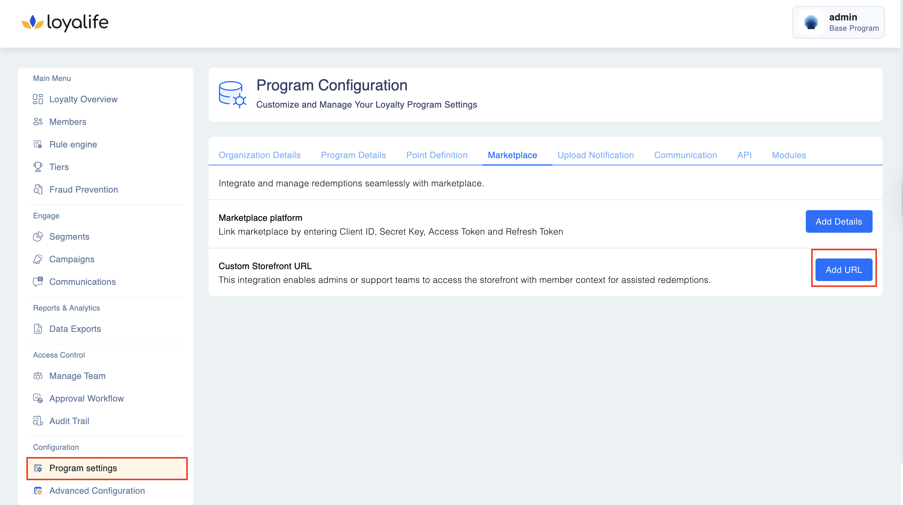 Navigate to Program Settings > Marketplace > Custom Storefront URL > Add URL