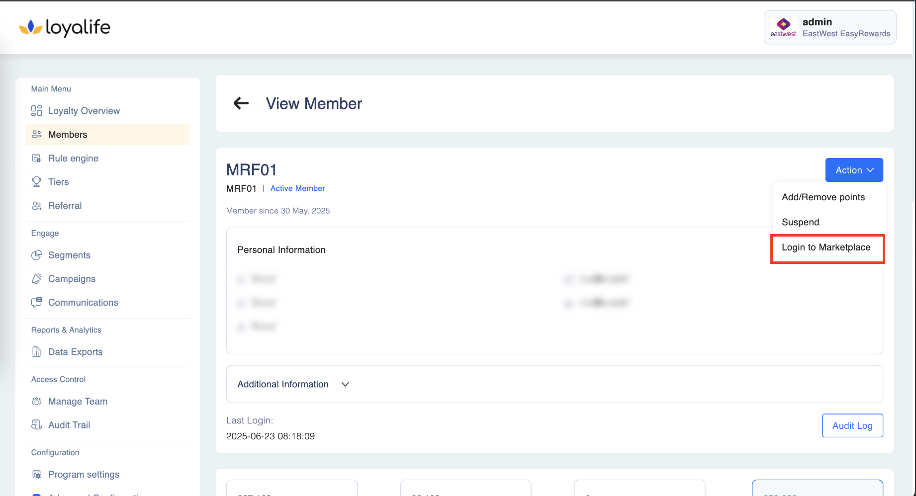 To login to marketplace, access a specific member account by navigating to Members → Search Members → Member Profile. Click on Action and select Login to marketplace.