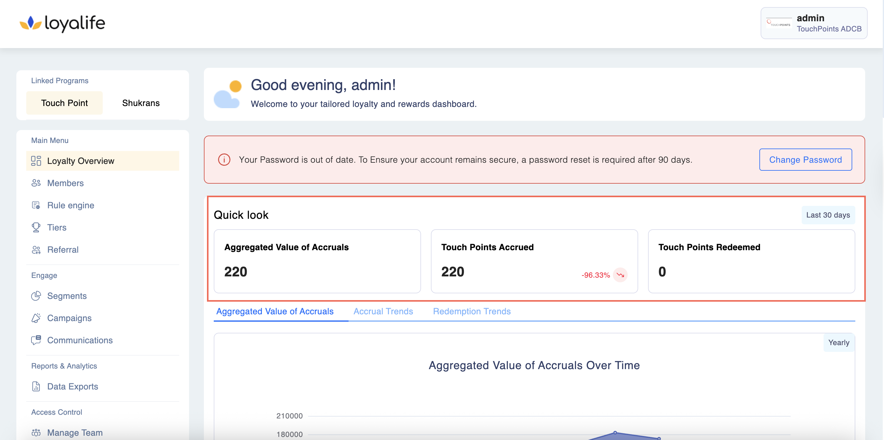 The Loyalife Dashboard provides a comprehensive overview of your loyalty program's key metrics, offering insights into accruals, redemptions, and member engagement trends. This guide will help you navigate the dashboard effectively.