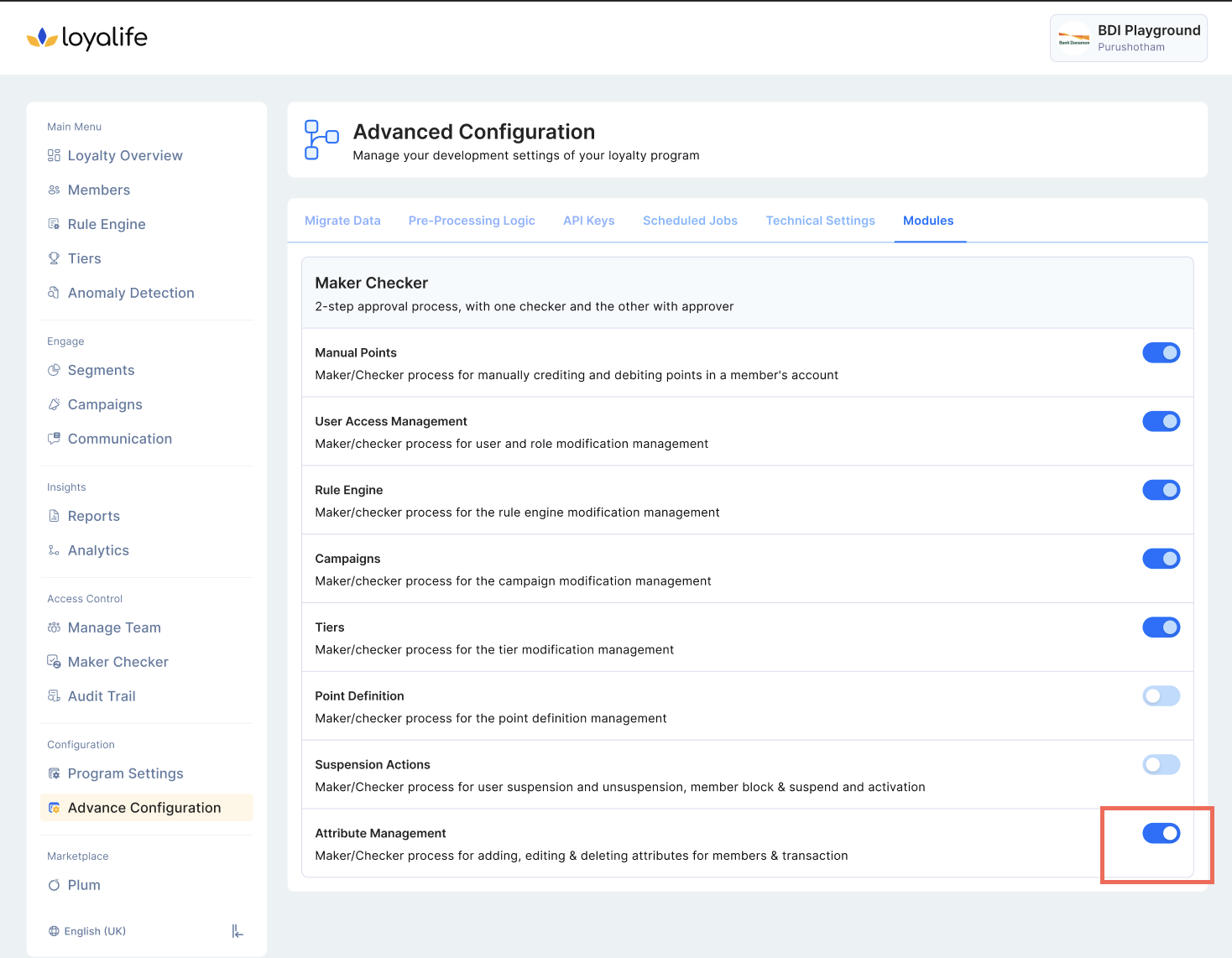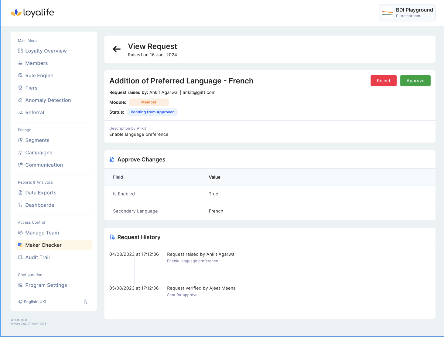 The Maker-Checker workflow is designed to enhance governance and compliance for Client BDI’s loyalty program. This workflow introduces a two-step verification process for all modifications to attributes in both the Member Management and Rule Engine modules. These changes can impact data flows, reward logic, and personalization, making auditability and control essential.