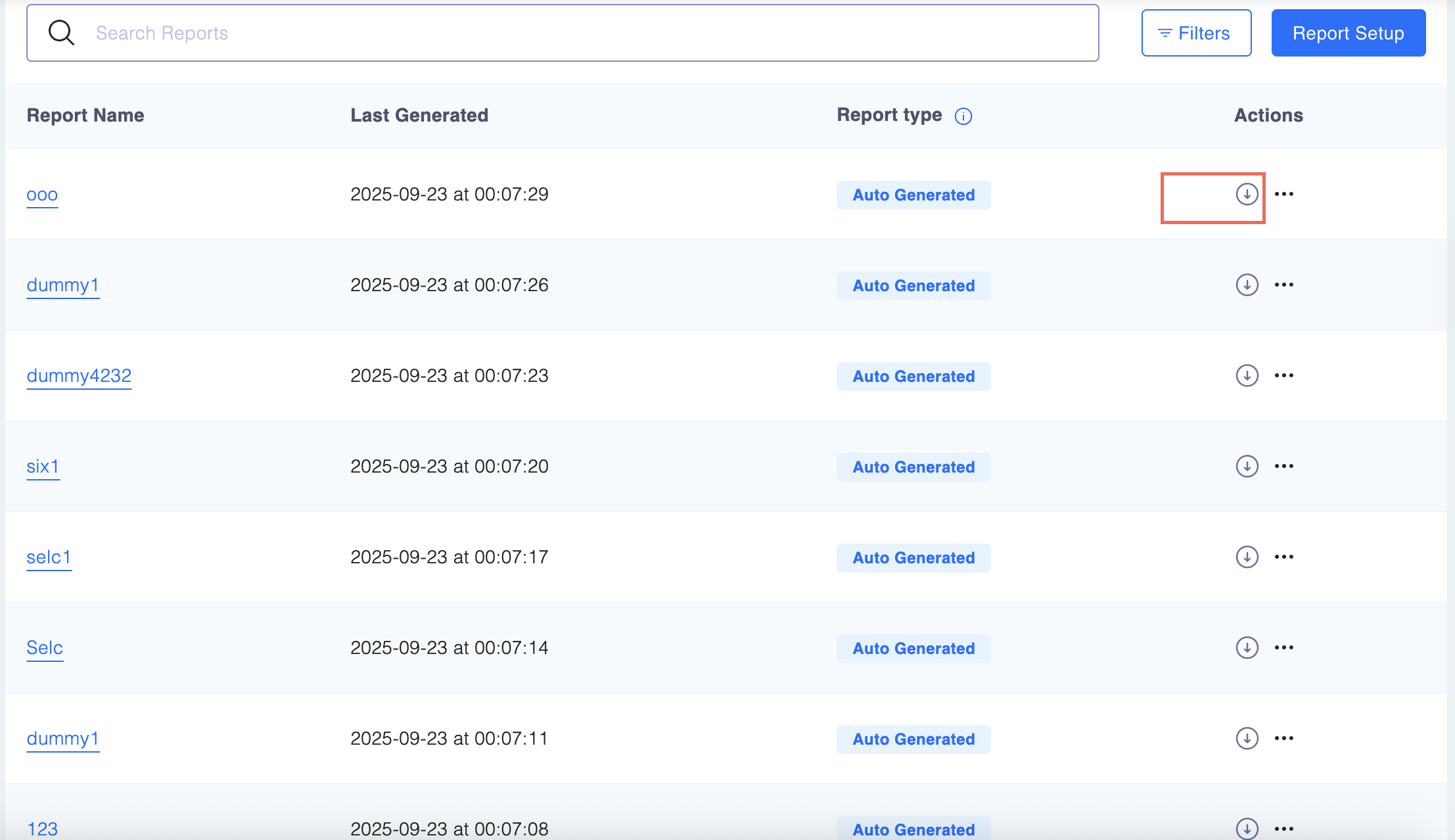 - After generating, you can download the report in available formats (e.g., CSV) for further analysis by clicking on the download button next to the relevant report as shown below.