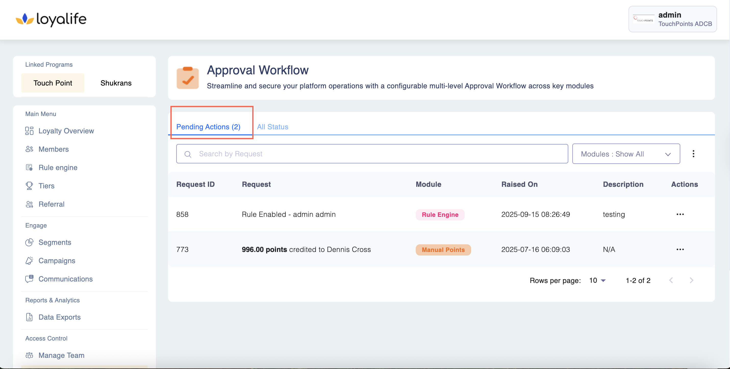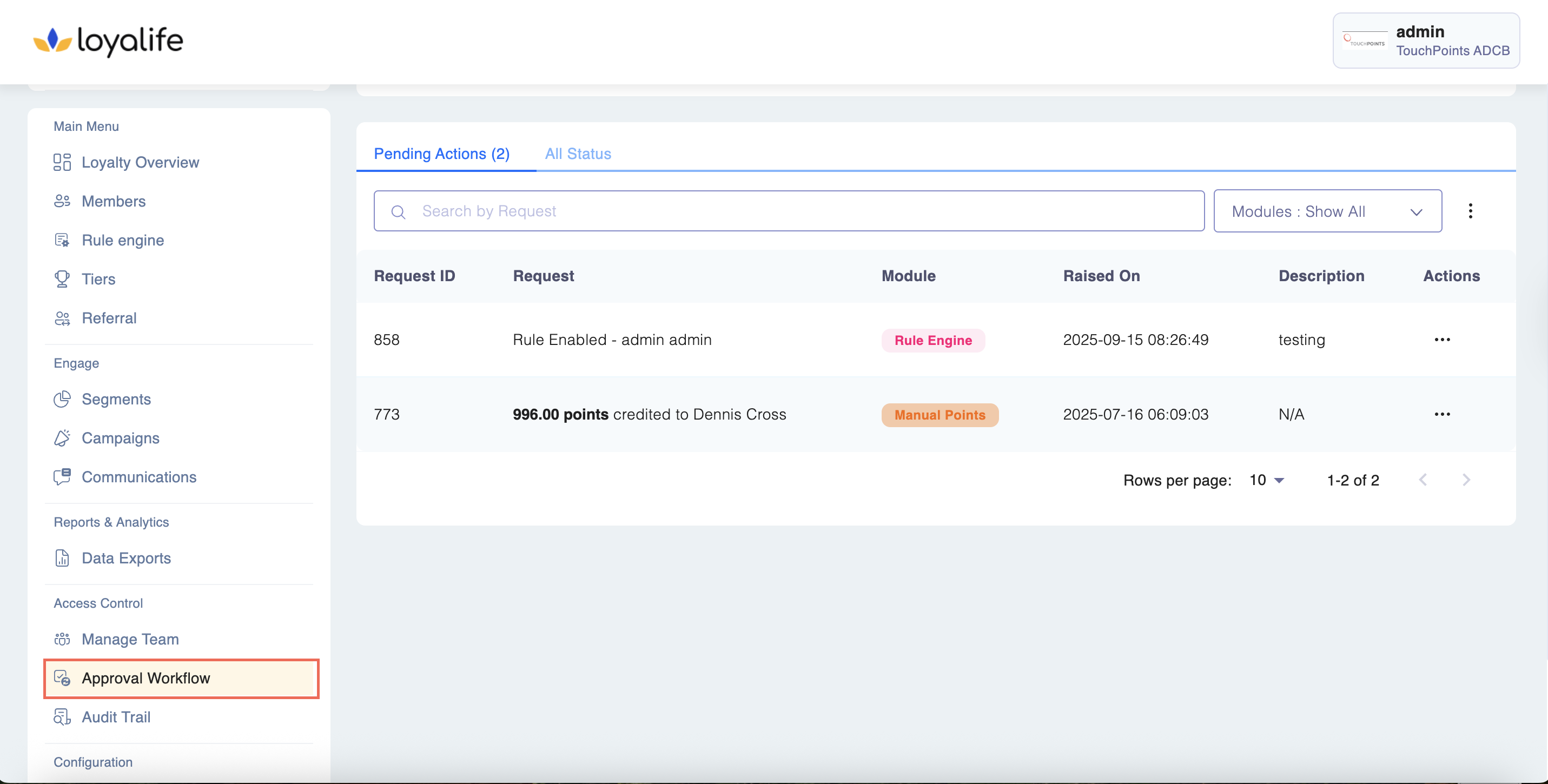 As a Maker, you can easily keep track of the transactions you've initiated and their current status. To view pending transactions awaiting review by the Checker and Approver, user can navigate to Access Control > Approval Workflow ➝ Pending Actions