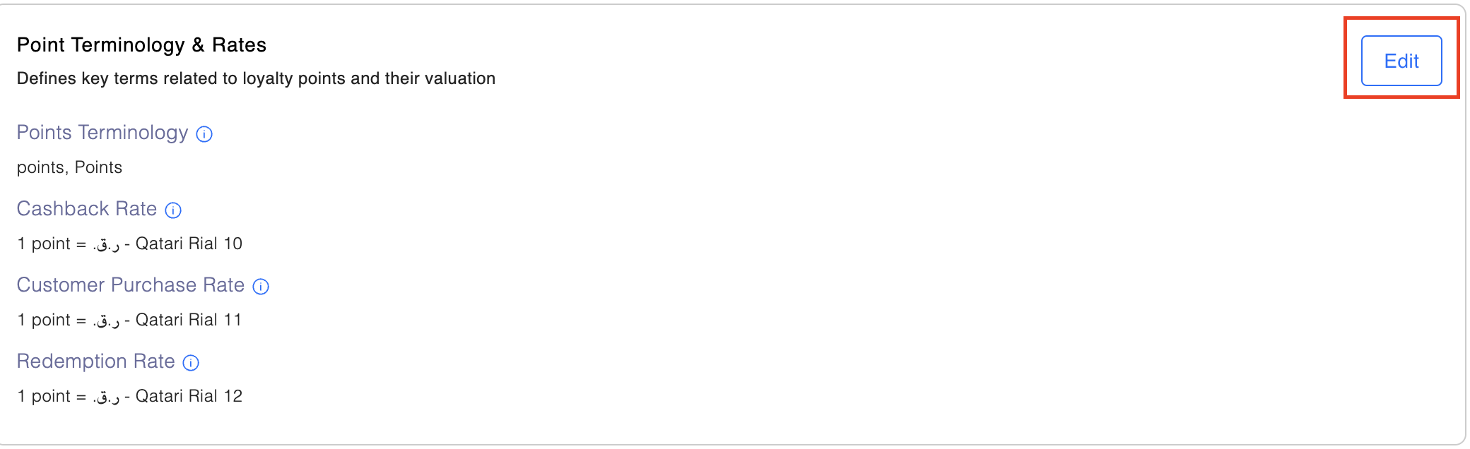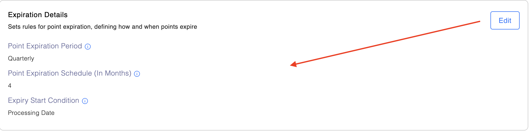 This sets rules for point expiration, defining how and when points expire. Click Edit next to the the Expiry Details card.