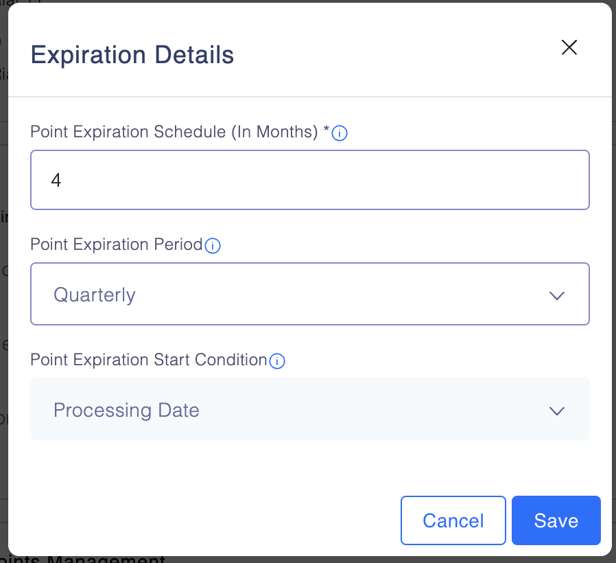 - Point Expiration Period: Defines how often expiry is calculated (e.g., Quarterly)