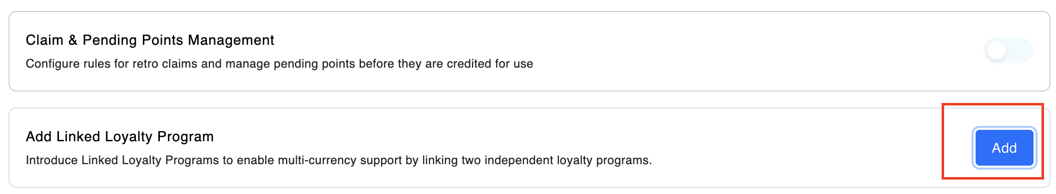 2.4.1 Enable multi-currency point handling by connecting independent loyalty programs for cross-redemption. Click on Add to enable this.
