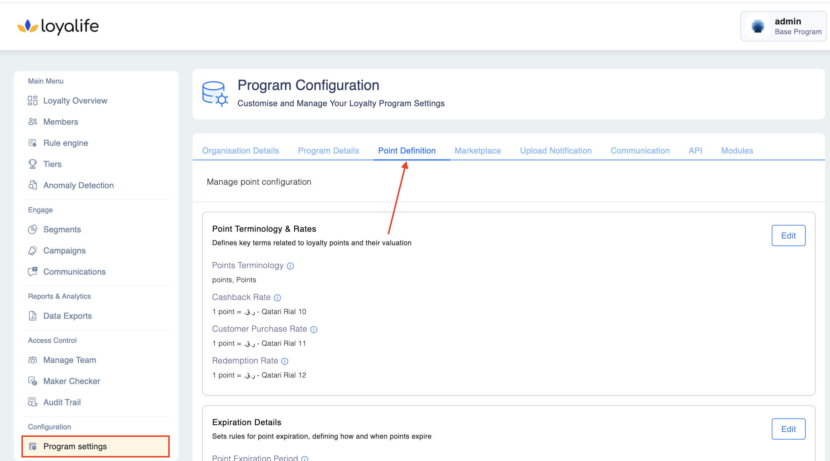 Step 1: Navigate to Configuration and Program Settings in the platform. Go to the Point Definition tab.