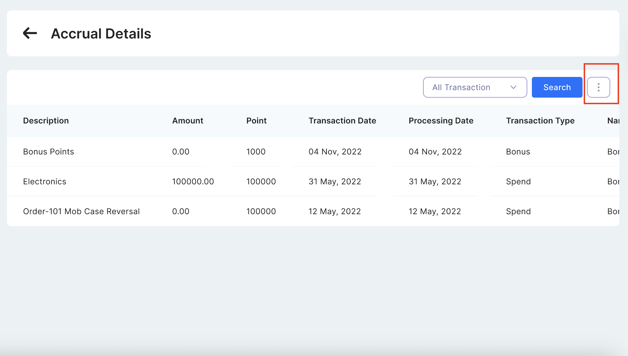 The total number of points earned by the member. Click on the box for a detailed summary of accrual transactions, where you can view: