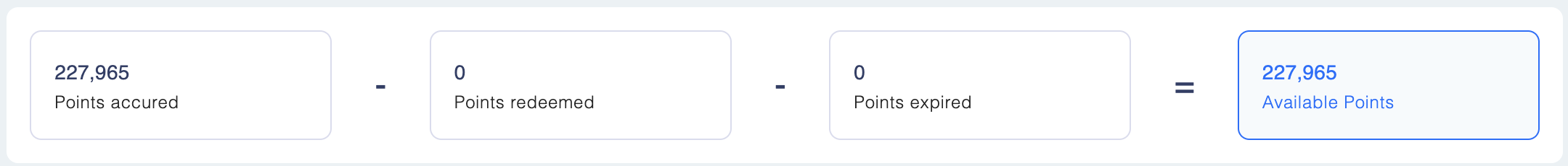 Points Available (Current Balance) = Points Accrued - Points Redeemed - Points Expired