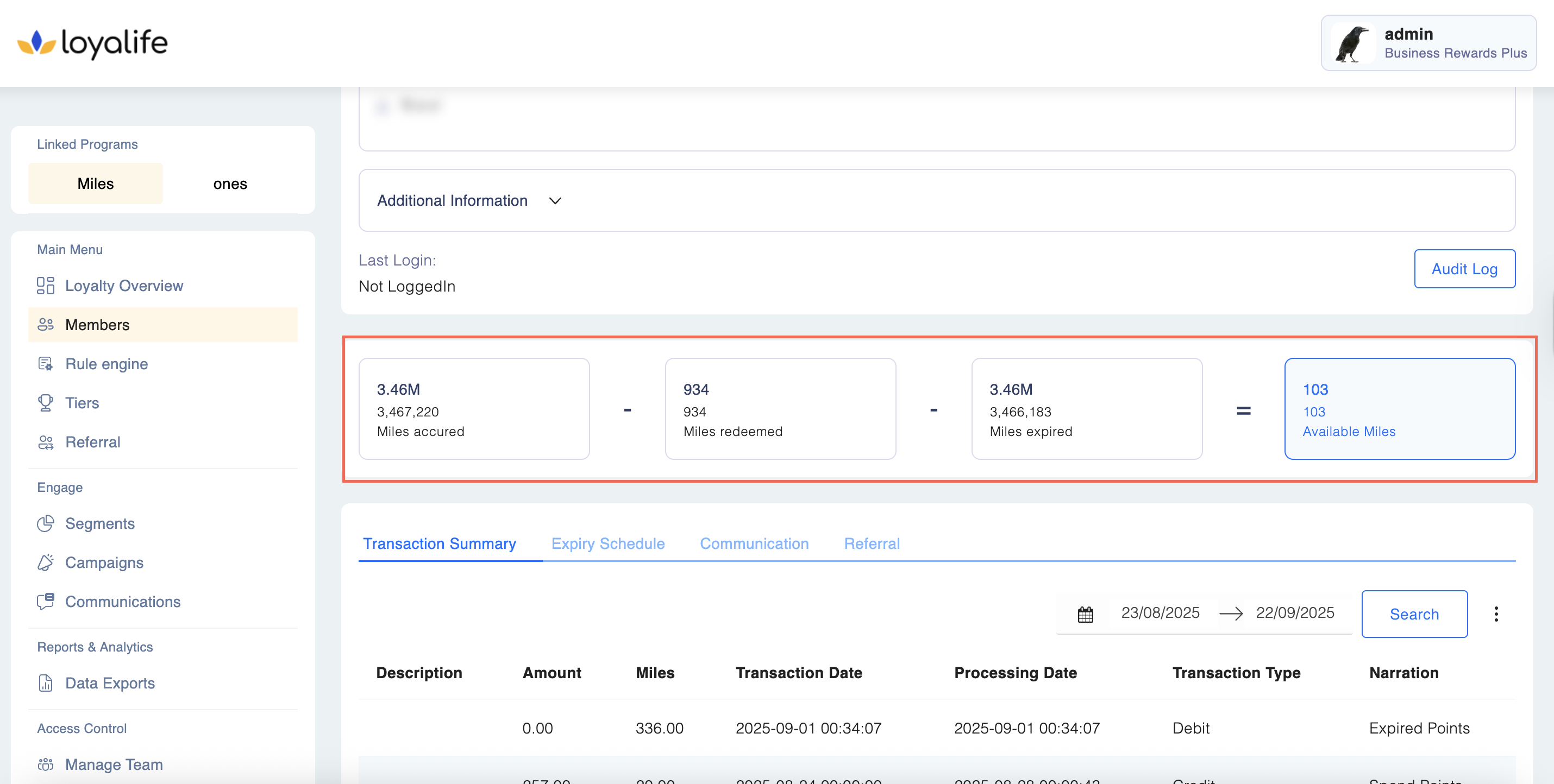 You can easily review a member's current point balance, accumulated points, redeemed points and expired points in Members → Member Profile