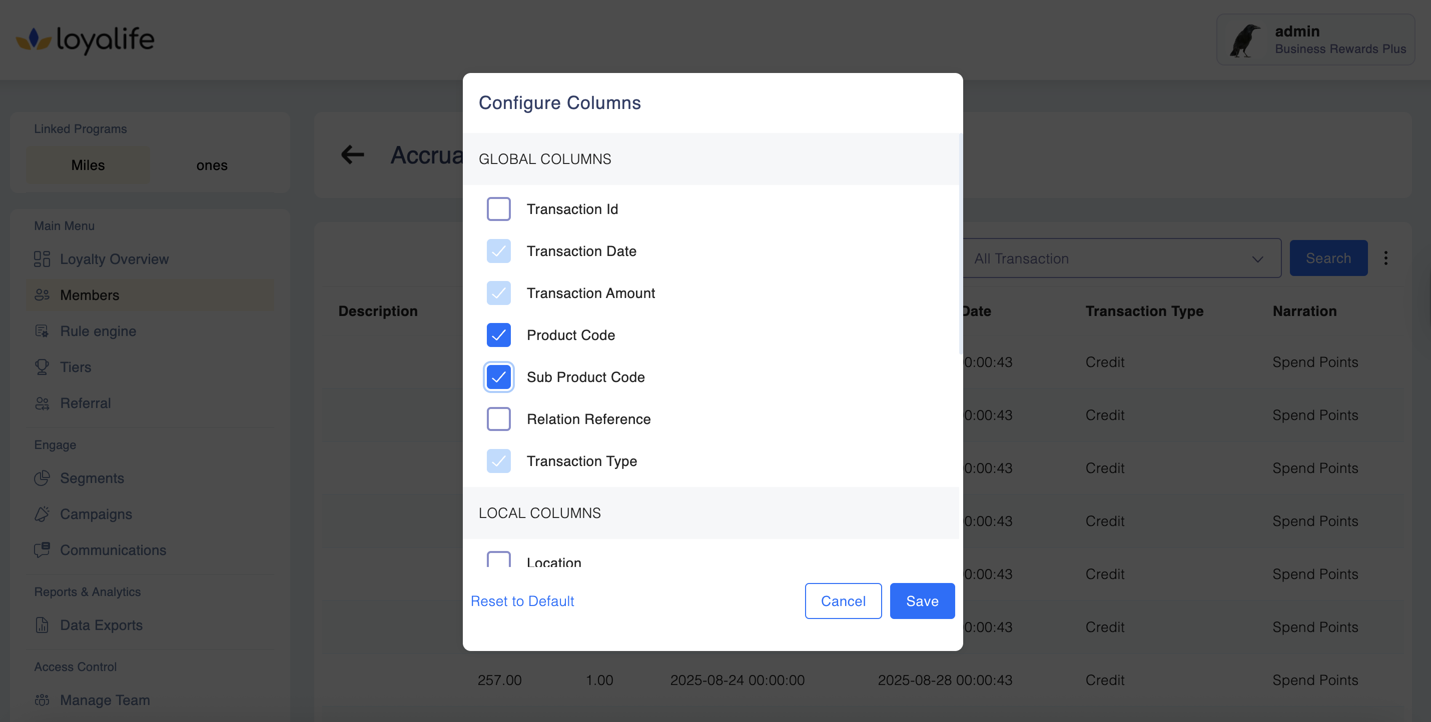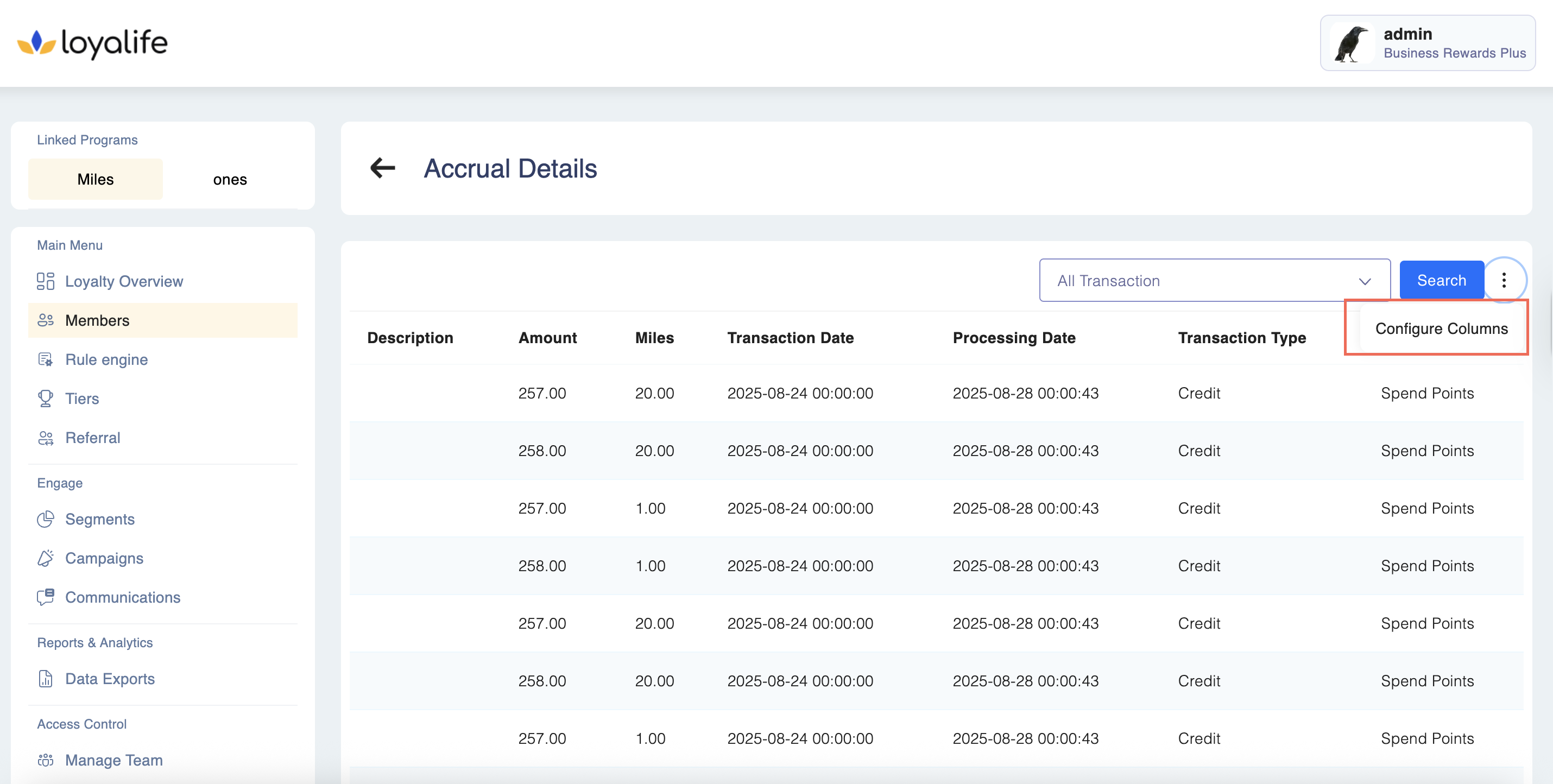 The Dynamic Column Configuration feature allows users to customize the Transaction Summary table under a member’s profile. Users can select which columns they want to view during their session, enabling a tailored and efficient experience. This configuration is session-specific and resets after logout or browser refresh.