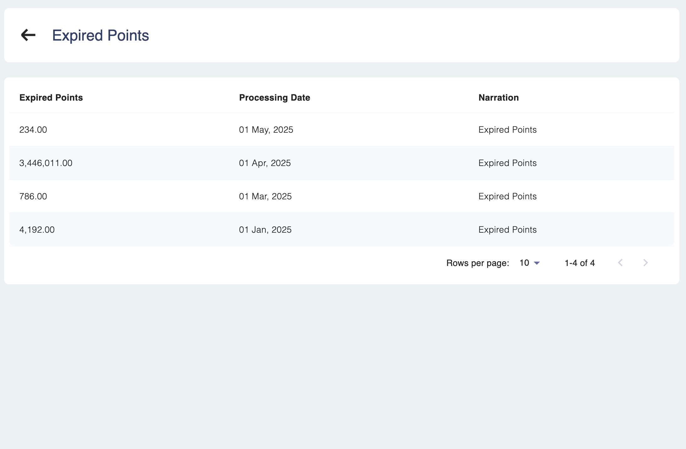 The total number of points that have expired according to the program's configuration. Clicking on the box will take you to a detailed summary of points redeemed, where you can view:
