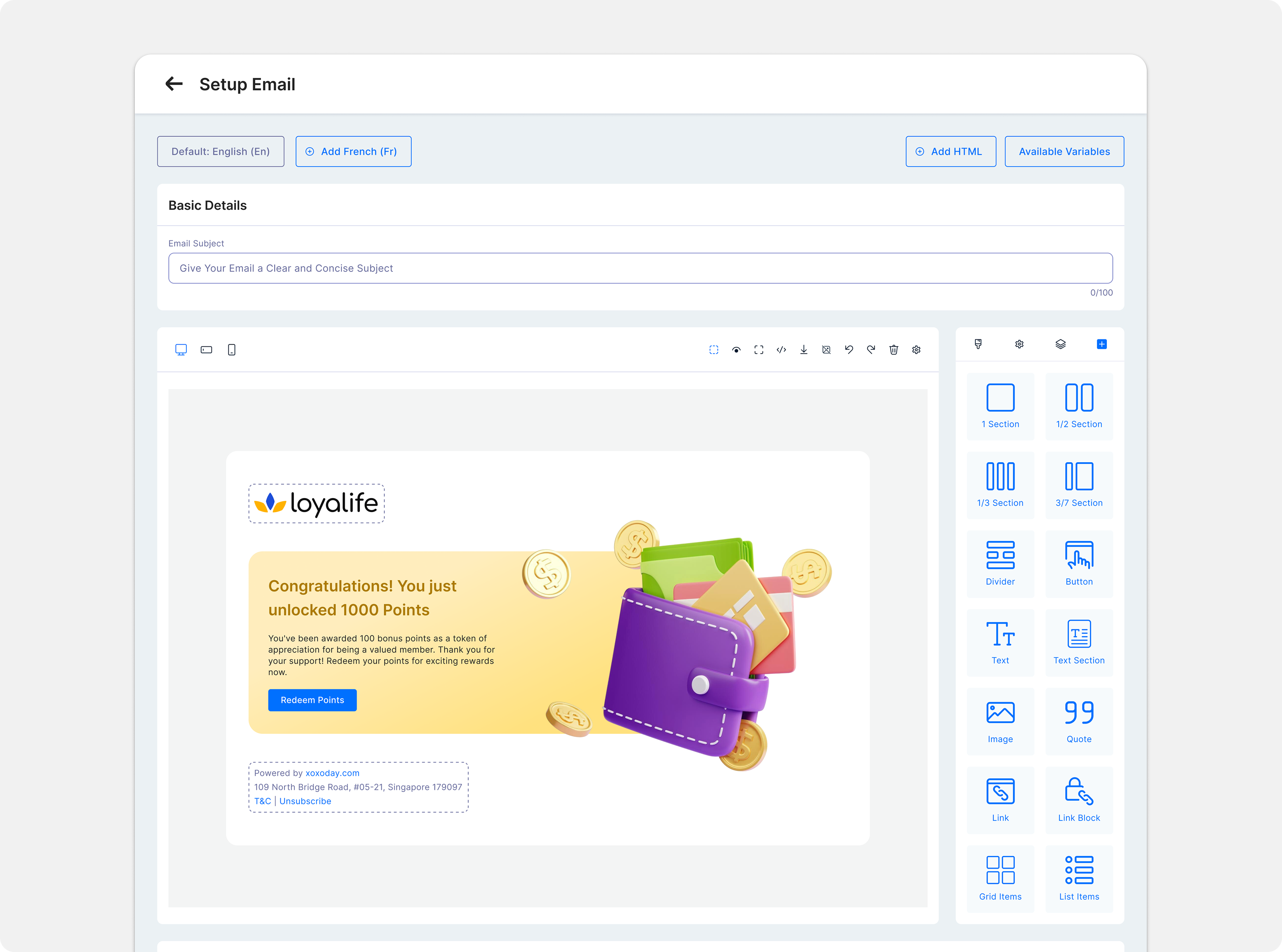 Use our new no-code, drag & drop editor to design branded templates visually with text, images, and buttons. Personalize them easily with dynamic fields like member_name and points_balance.