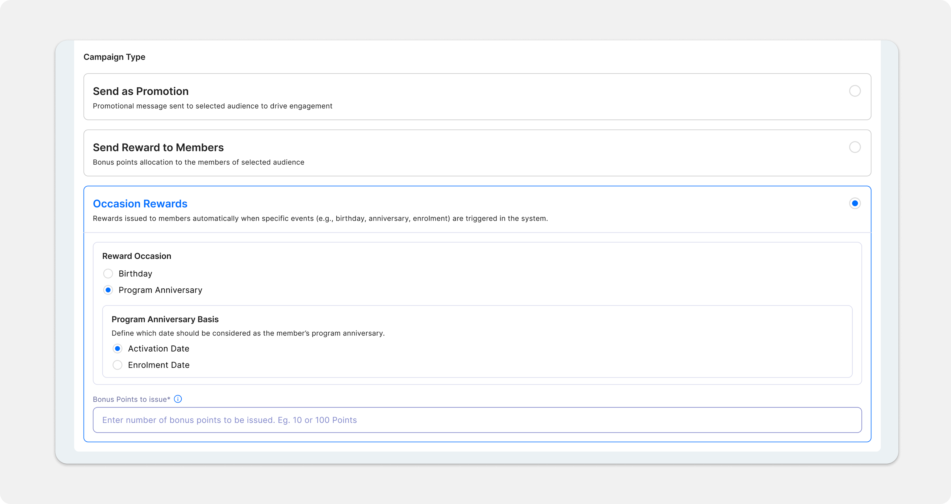 Celebrate member milestones automatically! The new Occasion Reward campaign automatically issues bonus points for birthdays and anniversaries, eliminating the need for daily segment tracking.