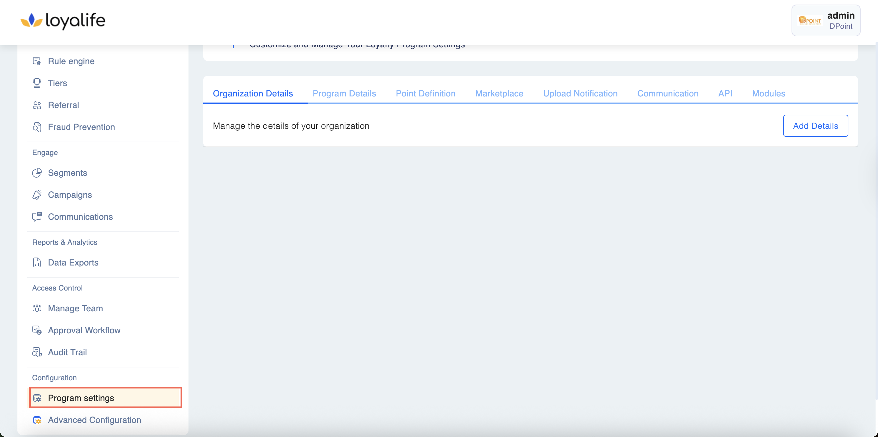 Navigate to Configuration > Program Settings and manage the different tabs.
