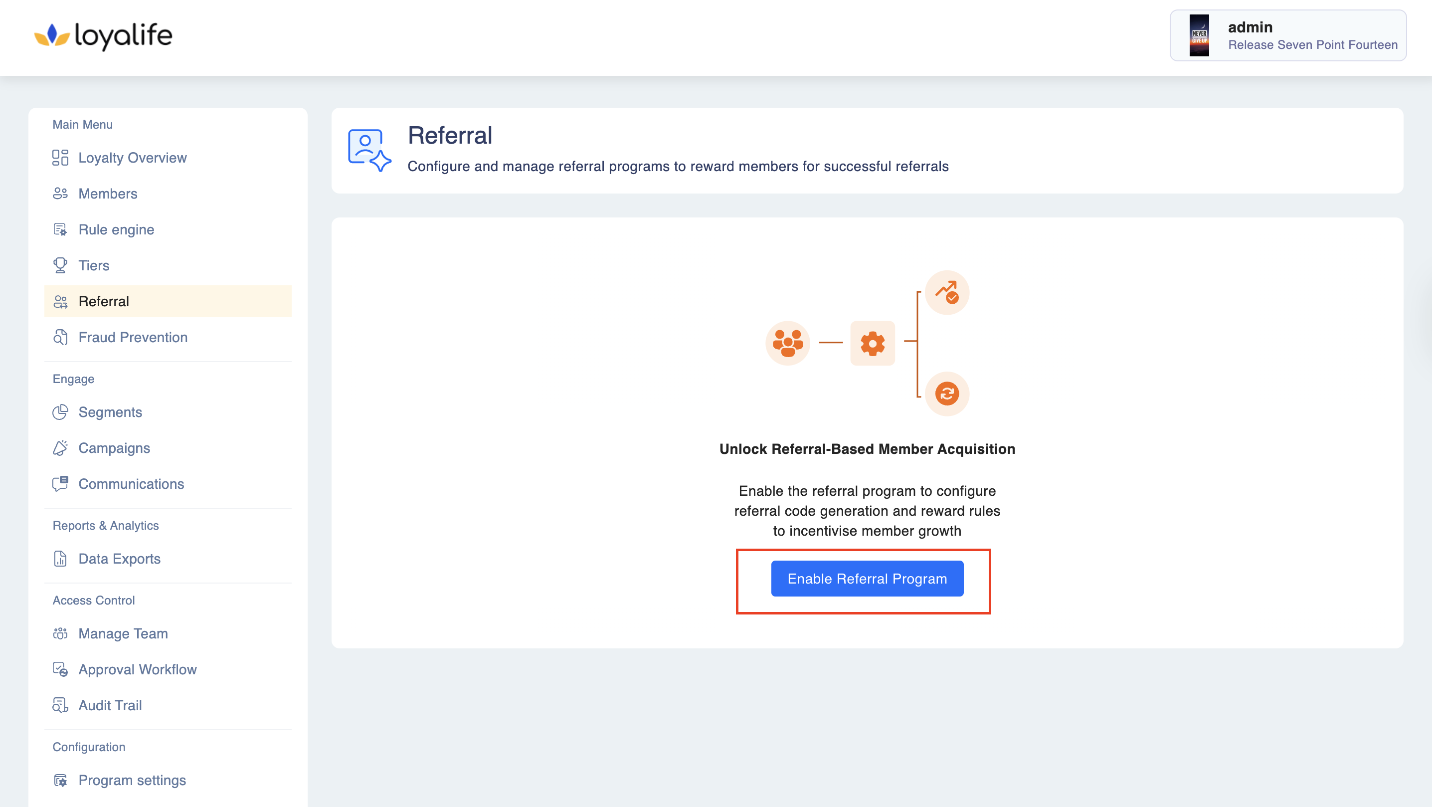 Step 1: Enable the Referral Program Navigate to the Referral tab in your left navigation menu. Click on the "Enable Referral Program".