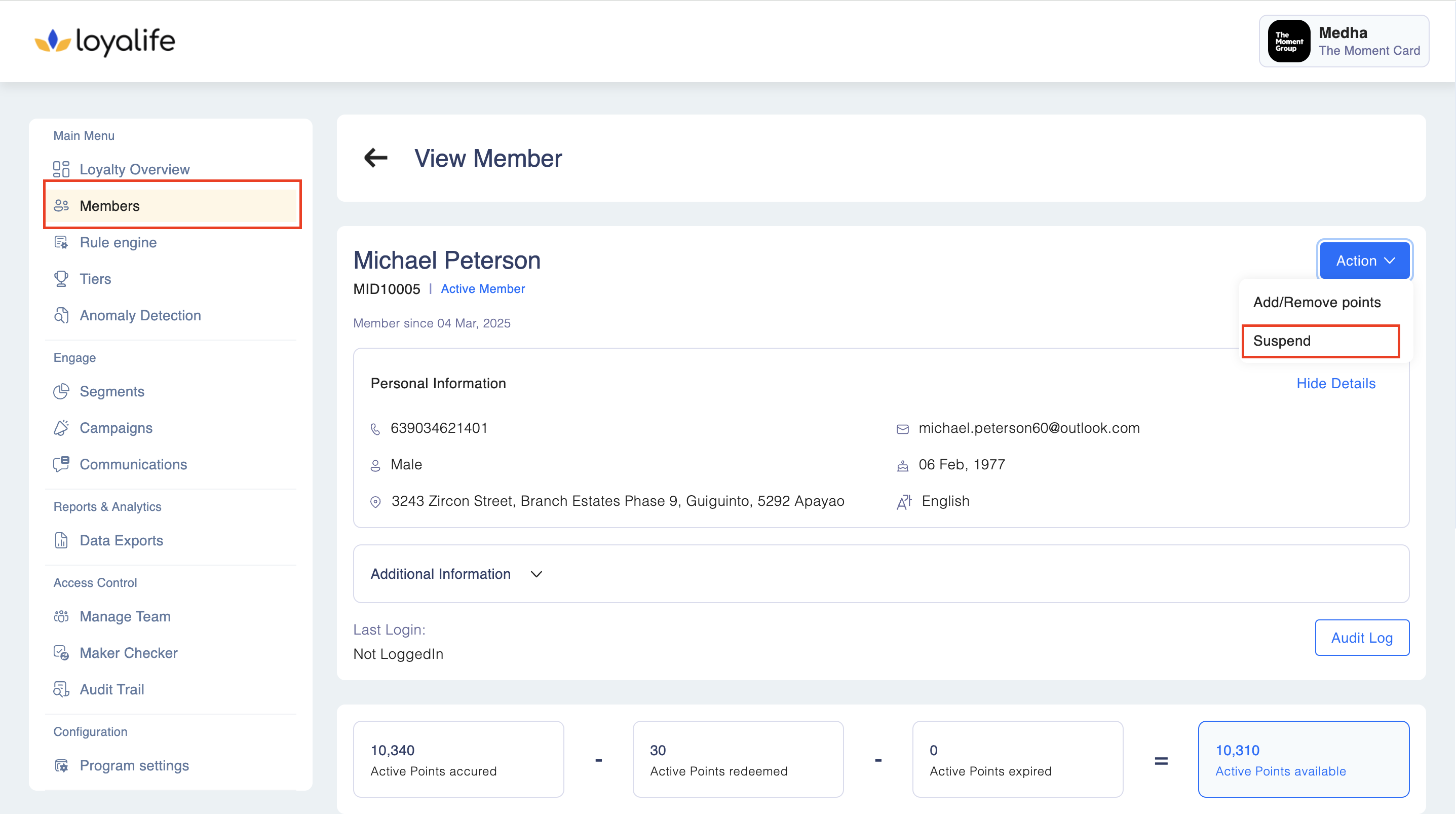 The Suspend Member feature in Loyalife allows administrators to temporarily restrict an active member’s ability to redeem points in the loyalty program's marketplace. Suspended members cannot redeem points or participate in any marketplace-related activities until the suspension is lifted. This tool is useful for addressing non-compliance issues, or pausing a member’s participation in the program.