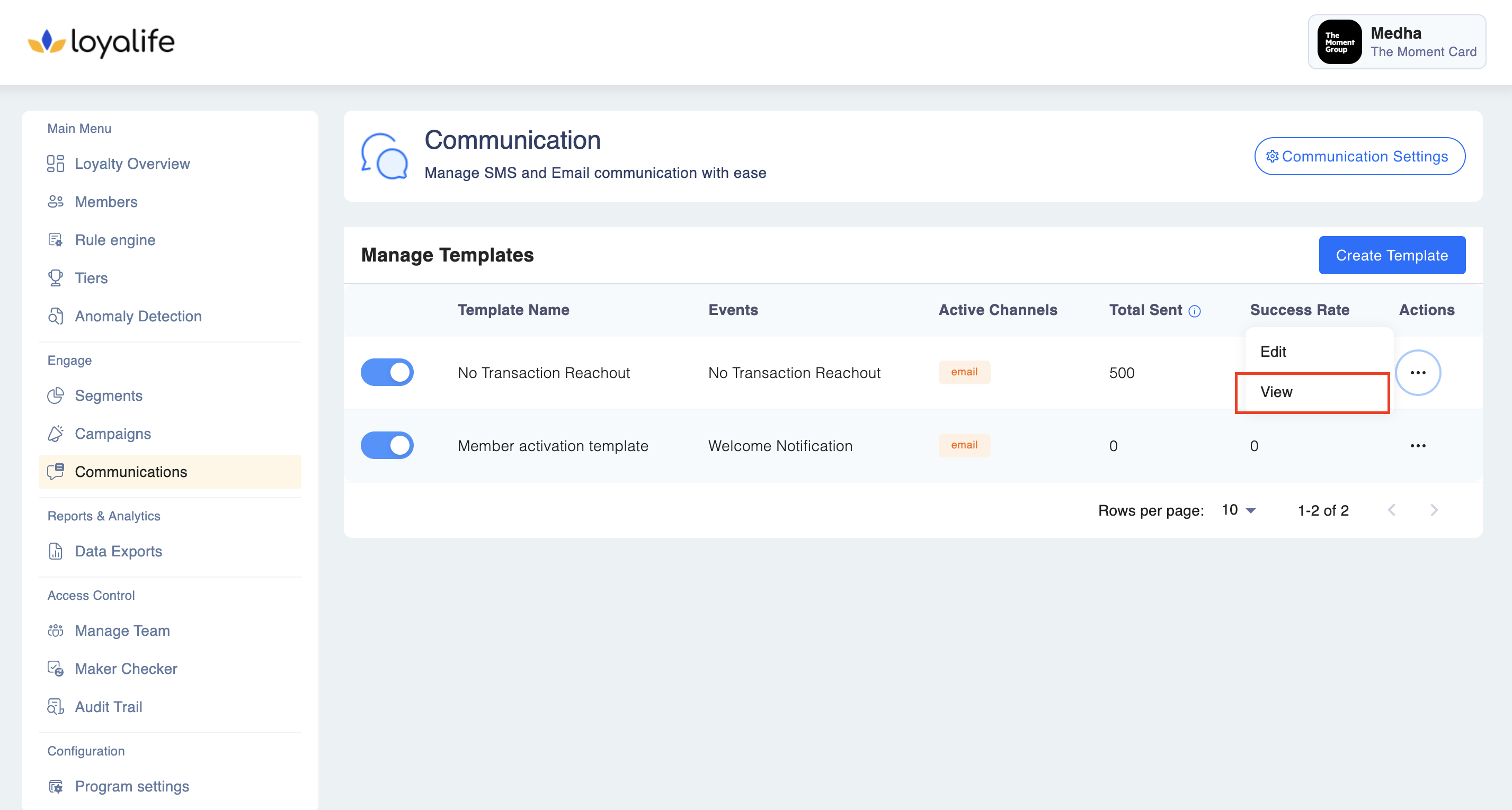 System communication - These communications are sent to the admin users. For example: Rule modification email, and user access management email. These all are internal communication to the admin. These emails cannot be edited from the Loyalife front end.